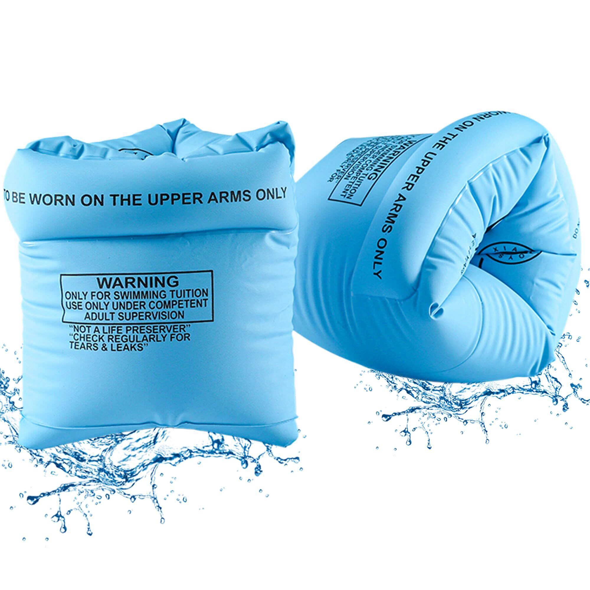 【製品仕様】パッケージ内容:アームリング*2。アームリングのサイズは、長さ20cm*高さ15cm(膨らませた後)。カラー:ブルー。重さ:80g、材質:PVC。空気室が上下の2室になる。
