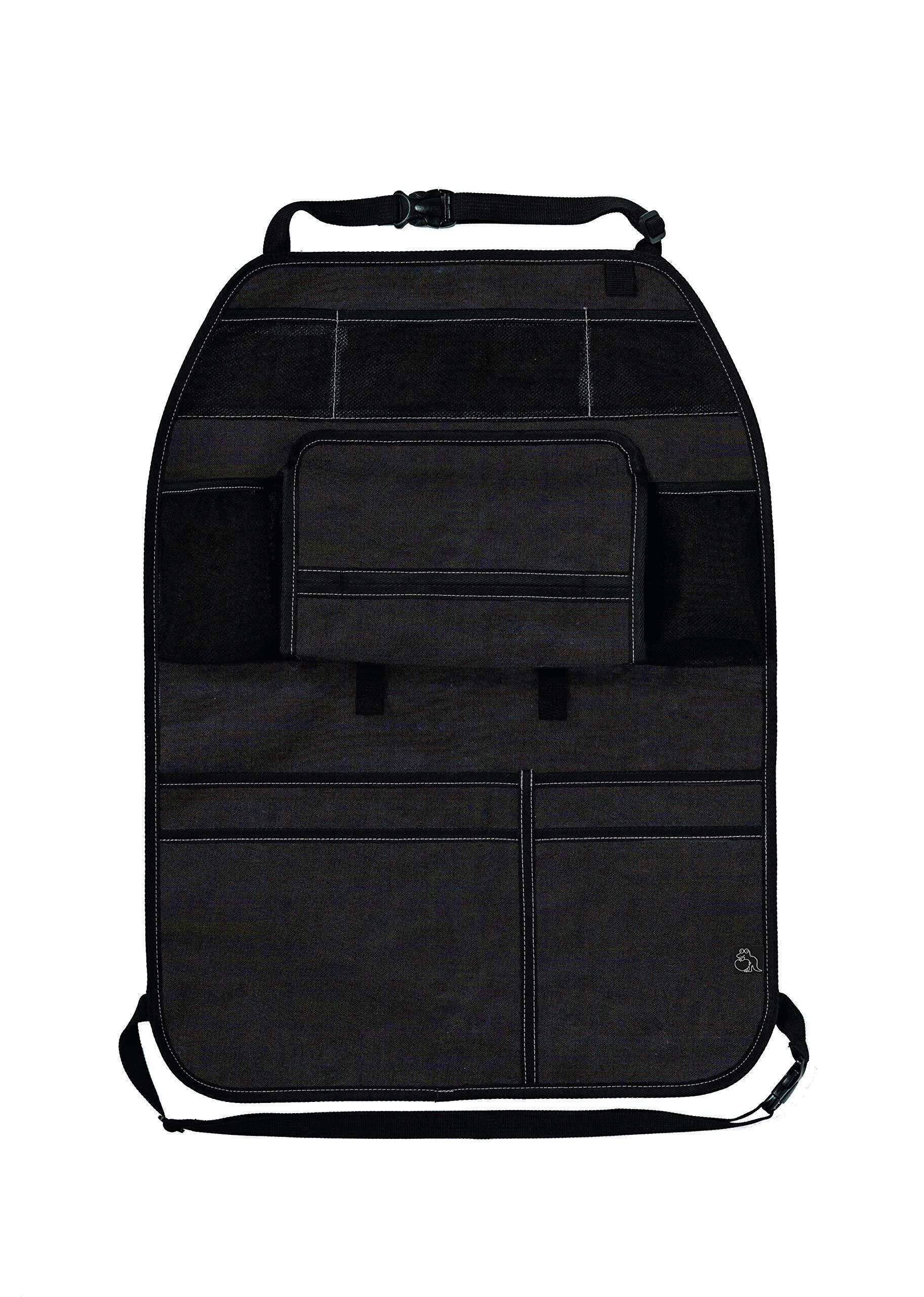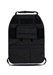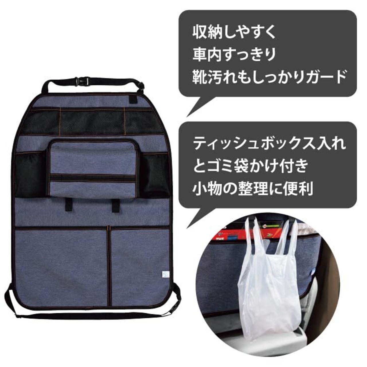 本製品は車のヘッドレストに固定し、シートの汚れ防止と小物の収納を兼ねたバックシート用オーガナイザーです。どんな車にも合わせやすいブラックにグレーのステッチがポイント。お手持ちのティッシュボックスをそのまま収納できます。必要な時にサッと取り出せて便利です。ポリ袋がかけられ、車内で出たごみ等を入れるのに便利です。2本分のドリンクホルダー付きで飲み物を置く場所に困りません。裾には大きなポケット付きでタオルや絵本を入れるのに便利。中身が見える便利なメッシュポケット付き。、小物の整理に便利です。お気に入りのおもちゃなどを引っ掛けられるループ付き!