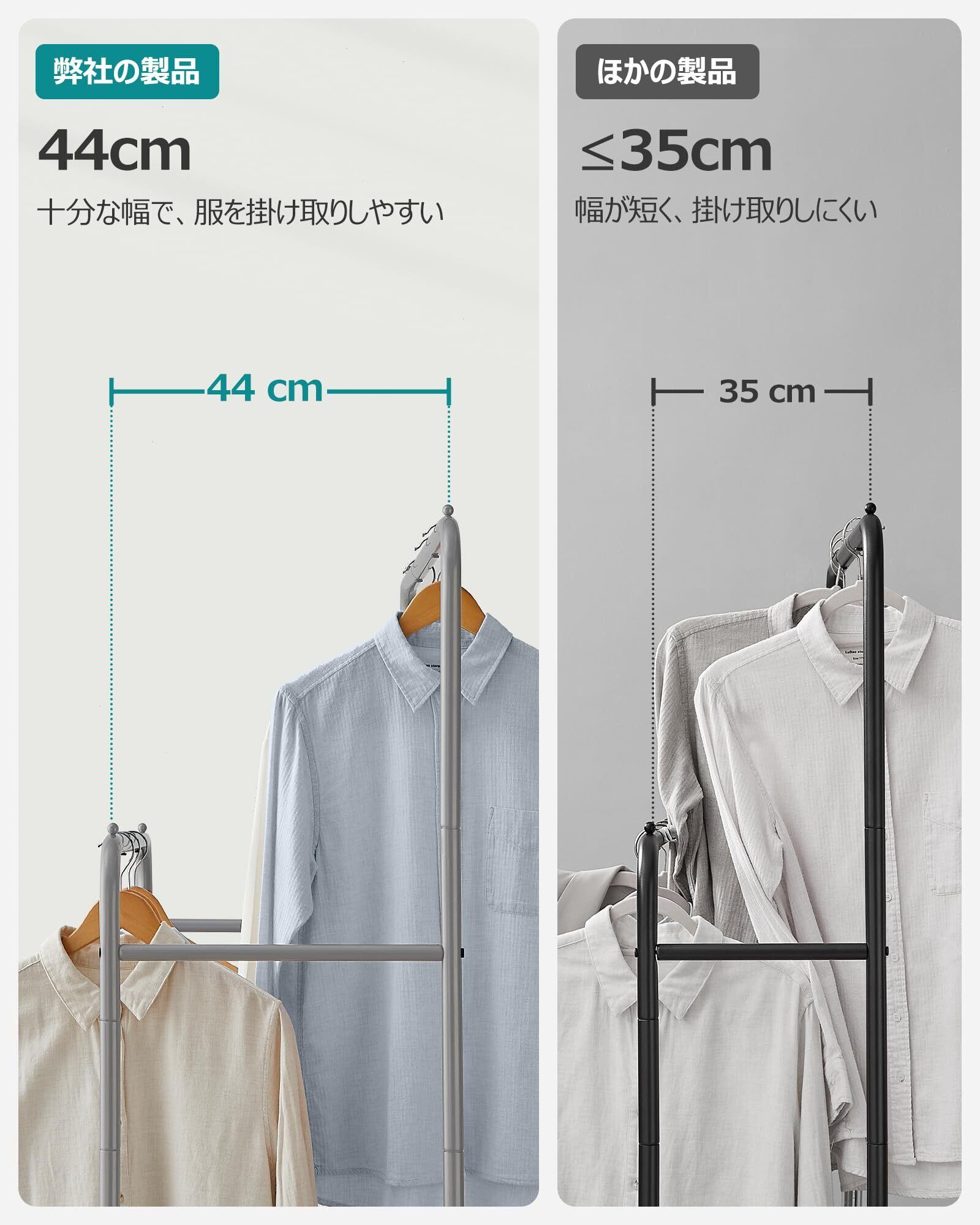 【細部へのこだわり】前後のポールの幅44cmであり、十分な幅で服の掛け取りしやすいです。部屋物干しラックとしてもご利用できます