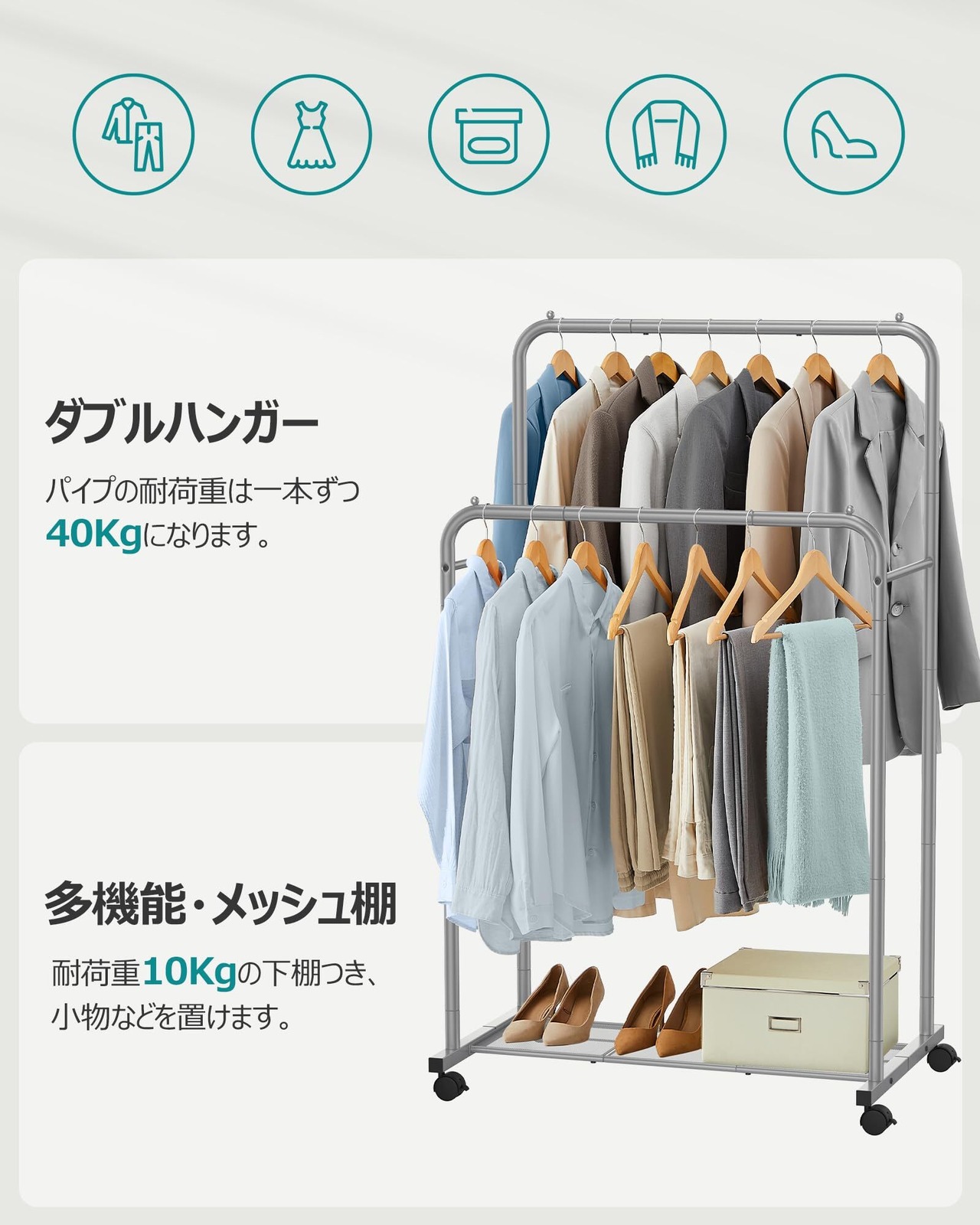【抜群の収納力】幅91cmと前後2本のポールで収納力がさせて、沢山の洋服、カバン等を掛けられます。底部棚板の設計、帽子、アクセサリー類、シューズラック、収納ボックス等を置いてお使い頂くことが可能です