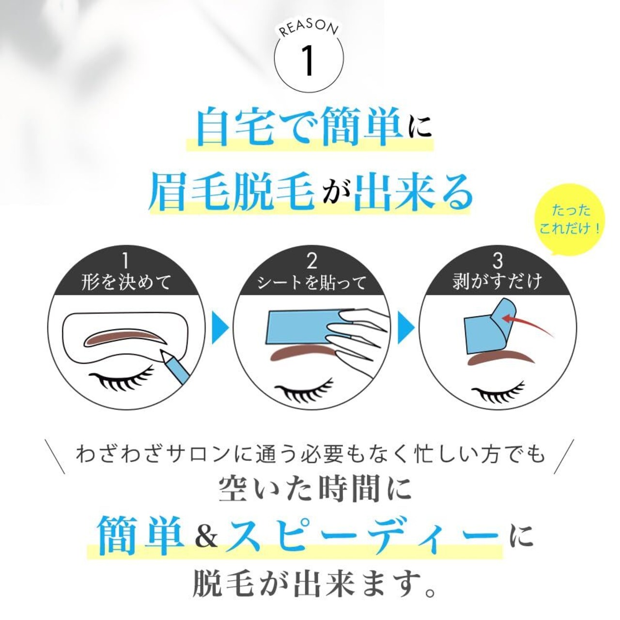 【使い方】①好みの眉プレートを眉にあてる ②眉毛ペンシルで枠を描く ③コンシーラーで余分なところを塗る ④ワックスシートを挟み、温める ⑤毛流れに沿ってシートを貼り、上から指でなぞる ⑥毛の流れと逆方向に一気にシートを剥がす