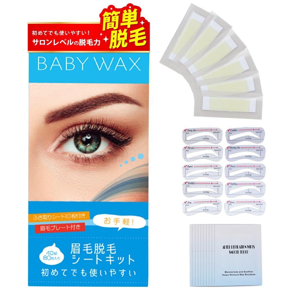 【自宅で簡単!理想の眉へ】累計売上個数25万個突破!BABY WAX 眉毛脱毛シートキット。【内容量】眉毛プレート10種・拭き取りシート10枚・脱毛シート40組80枚入り