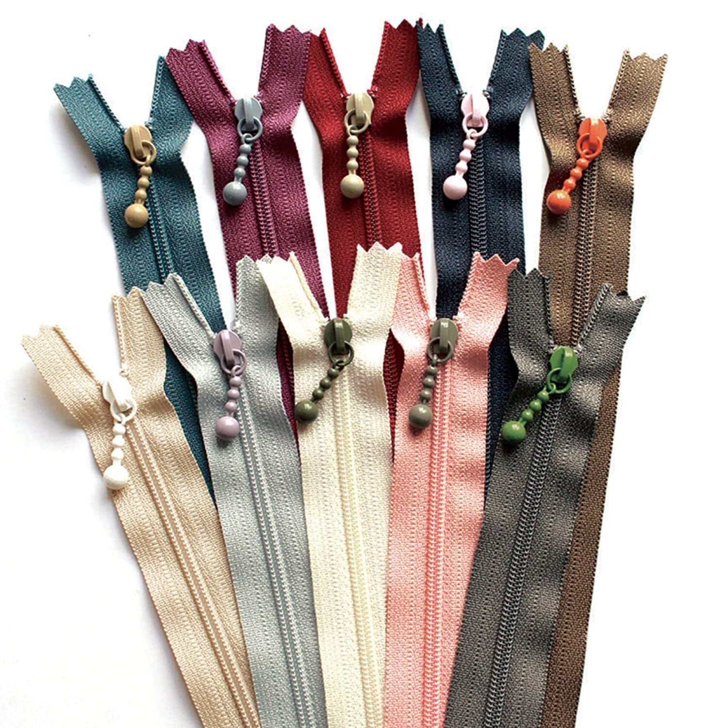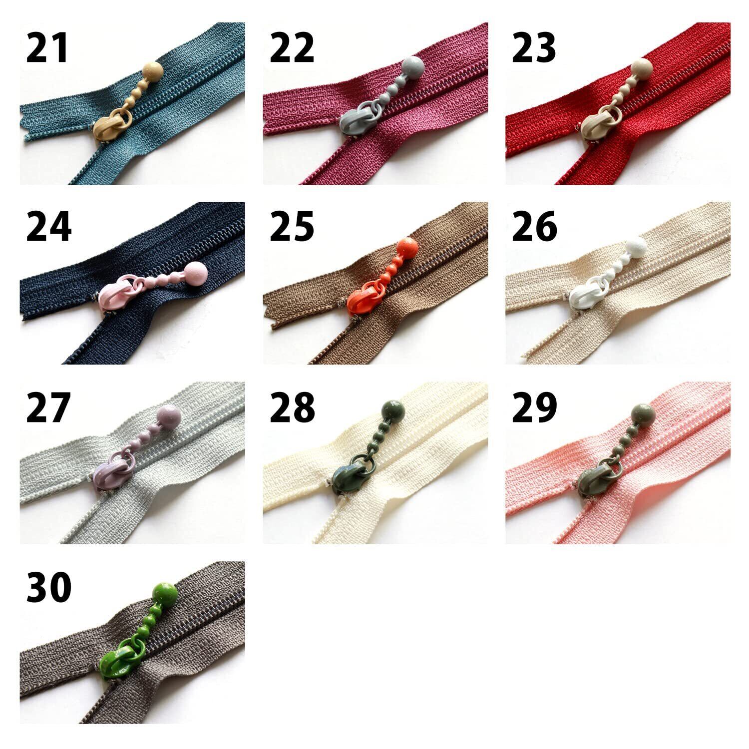 ポーチによく合うかわいいコイルファスナーです。玉付きスライダーと下止め金具が同色。モダンカラーを集めたセットです。