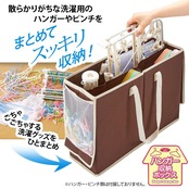 【洗濯用品をまとめてスッキリ収納】こまごまとして散らかりがちな洗濯用のハンガーから大型のピンチハンガーまでひとつにまとめてスッキリ収納!仕切りが付いているので、ハンガーとピンチハンガーを分けて収納できます。フタの裏側には洗濯バサミが入るメッシュポケット付き。