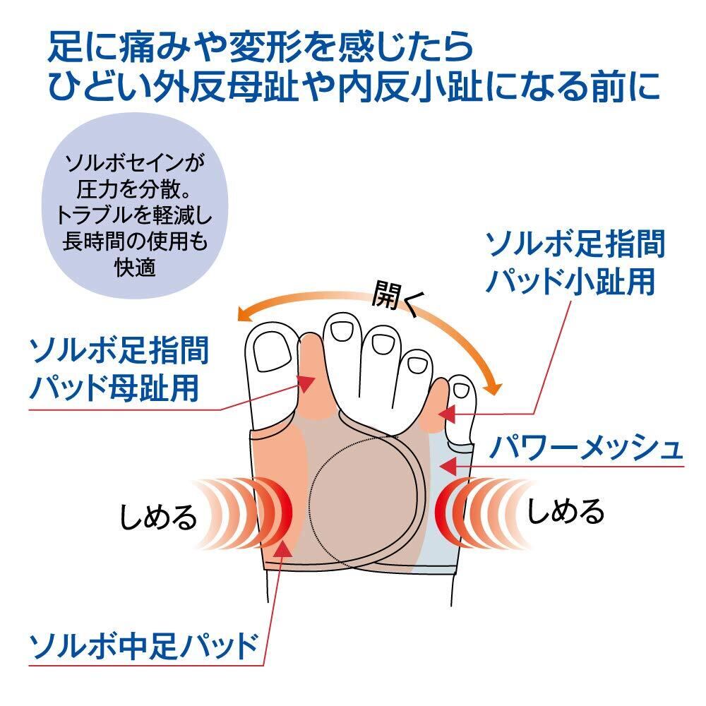 外反や内反による足指のトラブルに。固定力を自由に調整可能です。ソルボセインの優れた圧力分散・衝撃吸収機能により、足指間パッド母趾用と小趾用が、トラブルの軽減と、足指の曲がり、バランスを補整します。固定型なのに靴を履くこともできる、薄く通気性に優れたパワーメッシュ生地を採用し、面ファスナーで、固定力を自由に調整できます。適応サイズは、Sが21.5~23.0cm、Mが23.5~25.0cm、Lが25.5~27.0cmです。