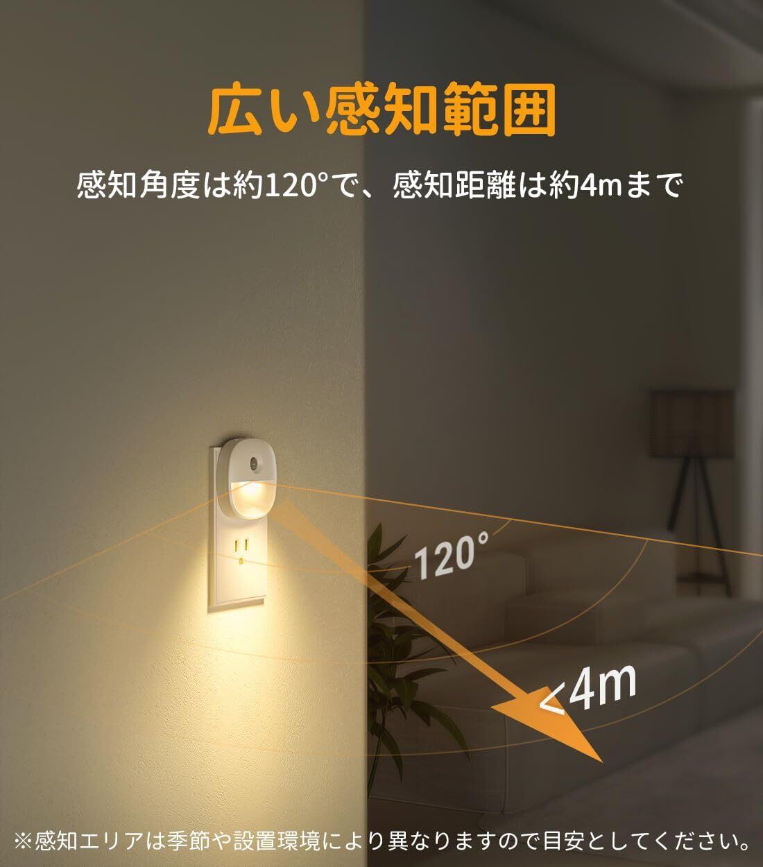 【ご注意】①本製品は2個入りなので、つまり1箱には2個のライトが入れています。予めご了承ください。②本製品は暗闇環境のみ作動します。③調光ボタンを長押しすると、光量を調整できます。※最小·最大のところになるとランプが点滅してお知らせいたします。④ンセントに差し込んで、ランプが約数秒点灯してから消灯し、待機モードに入るので、故障じゃないです。⑤人感センサーモードにて、検知エリア内で動き続けると、点灯時間はそのまま延長されます。⑥熱の影響を受けやすい場所への設置は避けてください。