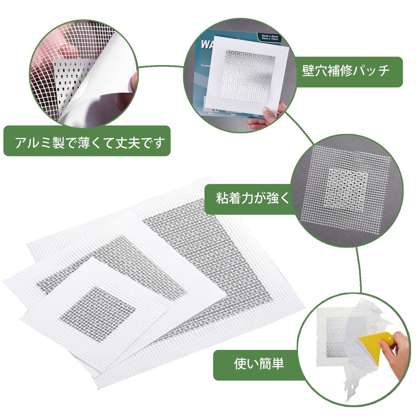 【セット内容】20cm×20cm (アルミメッシュサイズ:15cm×15cm、補修サイズ目安:13cm×13cm)4枚、粗さ違う4寸サンドペーパー2枚、パテベラ1枚、使い捨て手袋1枚、簡易取扱説明書が含まれています。(パテを含まれていません)