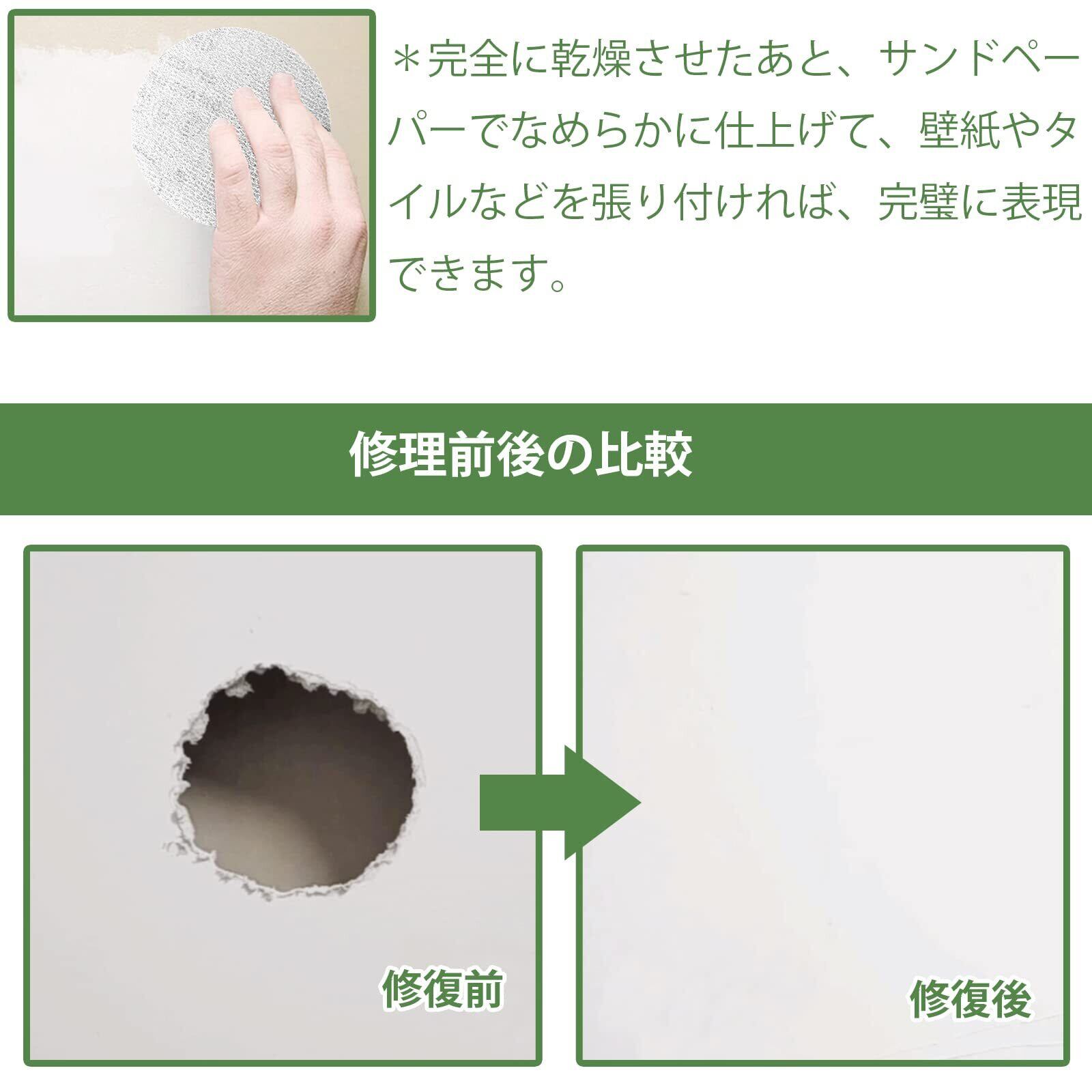 【完璧な壁穴補修キット】❶壁穴の補修を専用としているリペアプレートはたいへんお得な2枚組! 万が一失敗しても安心です。❷補修時のニーズに合わせて2種類の粗さのサンドペーパーをご用意。❸適切なサイズのパテベラでパテを滑らかな平らにのばせます。❹手が汚れないように、使い捨て手袋を用意しています。