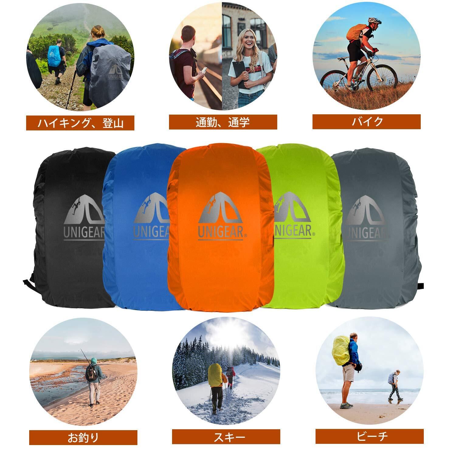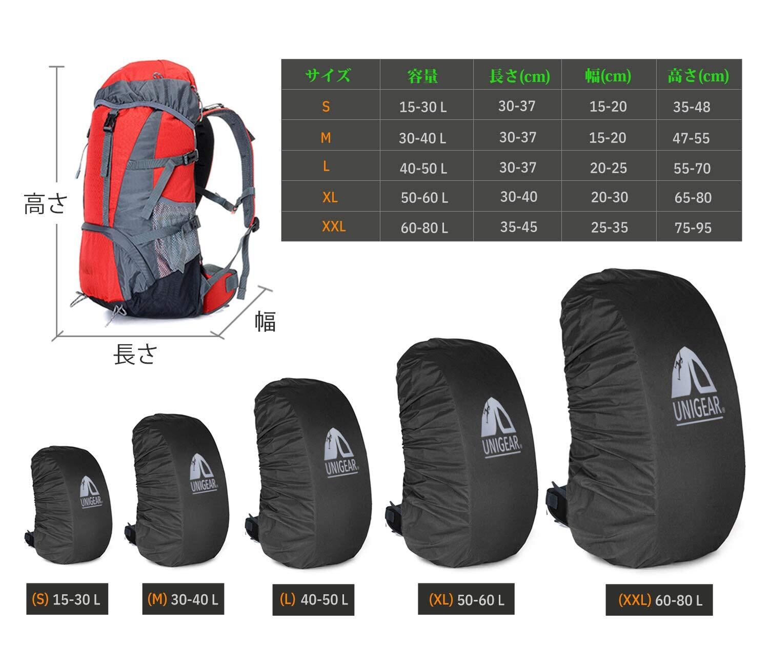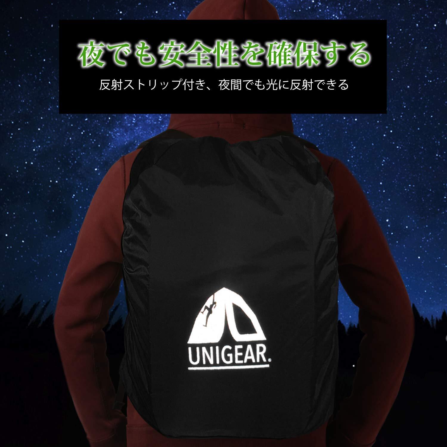 [Unigear] リュックカバー レインカバー 雨よけ ザックカバー 防水カバー 2倍以上の防水 耐水压5000mm 夜間反射 アウトドア 通勤 通学 梅雨対策 収納袋一体化 超軽量 5カラー 5サイズ 15L-80L
