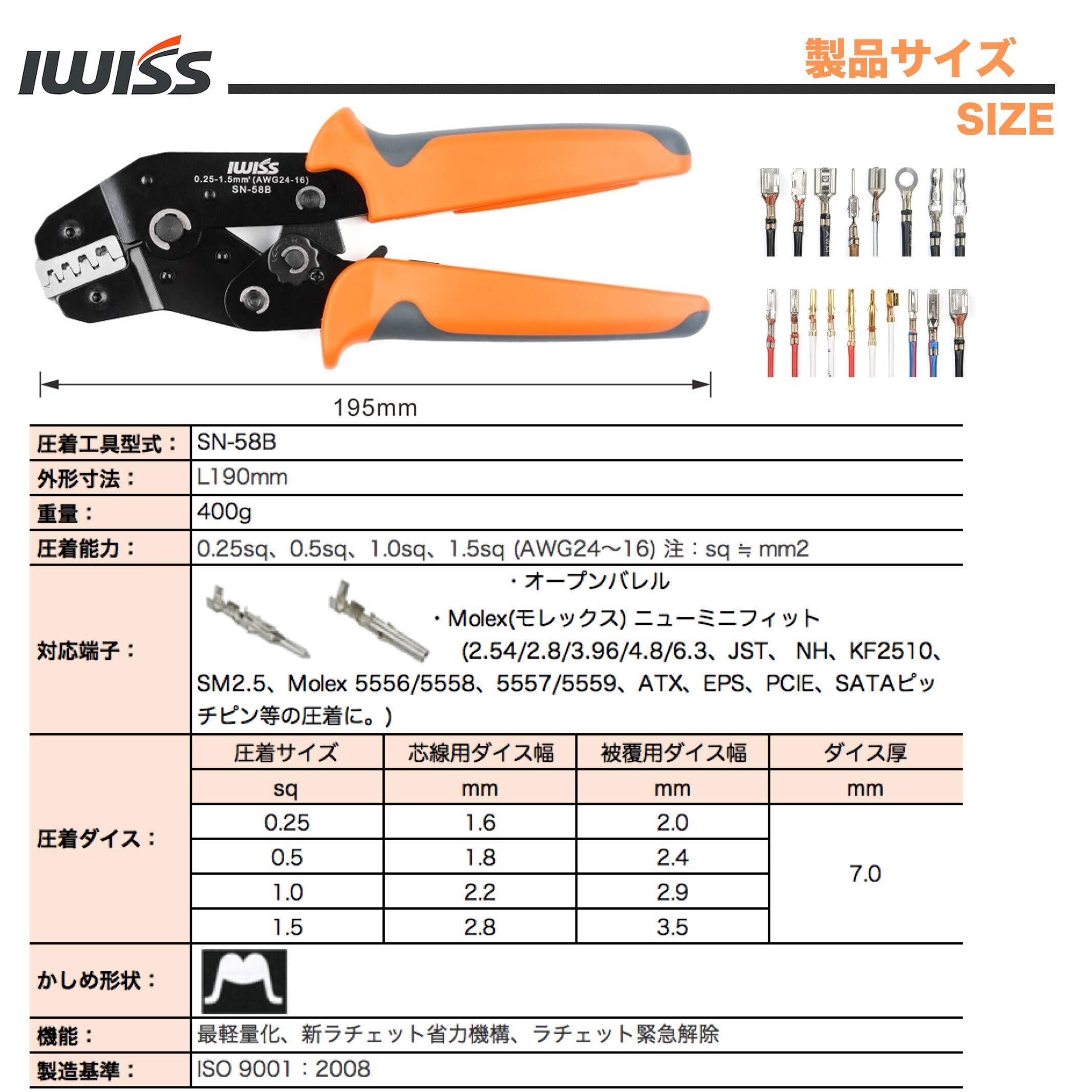 アイウィス(IWISS) 精密同時圧着ペンチ ラチェット式 オープンバレル端子 0.25〜1.5mm2小・中型端子対応 SN-58B