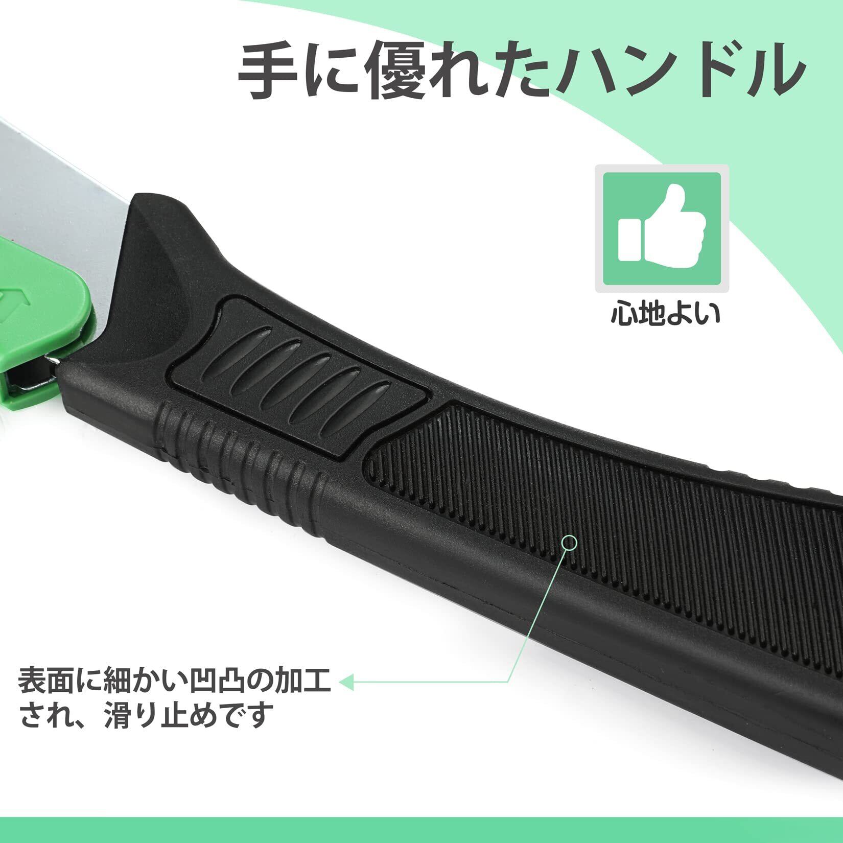 【人間工学に基づいた快適なハンドル】のこぎりは、素材によっては強い力を加えなくてはいけません。握りにくい商品を使用すると手に負担がかかり、指を痛めてしまう可能性があります。この折りたたみ式ソフトハンドルは、細かいPP+TPRで作られており、人間工学に基づいたデザインにより、作業中の手や腕の疲労を軽減します。表面に細かい凹凸の加工され、滑り止めです。固定することにより刃の揺らつきを防ぐため、ハンドルの背部に緑セキュリティーロックが付いています。セキュリティーロックを押したまま、ノコギリの開けると閉じることを行います。
