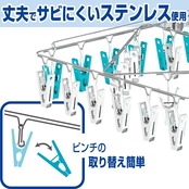 コンパクトフレームにピンチがぎゅっと付いた、丈夫でサビにくいステンレス製ハンガーです。ピンチ54個付き。