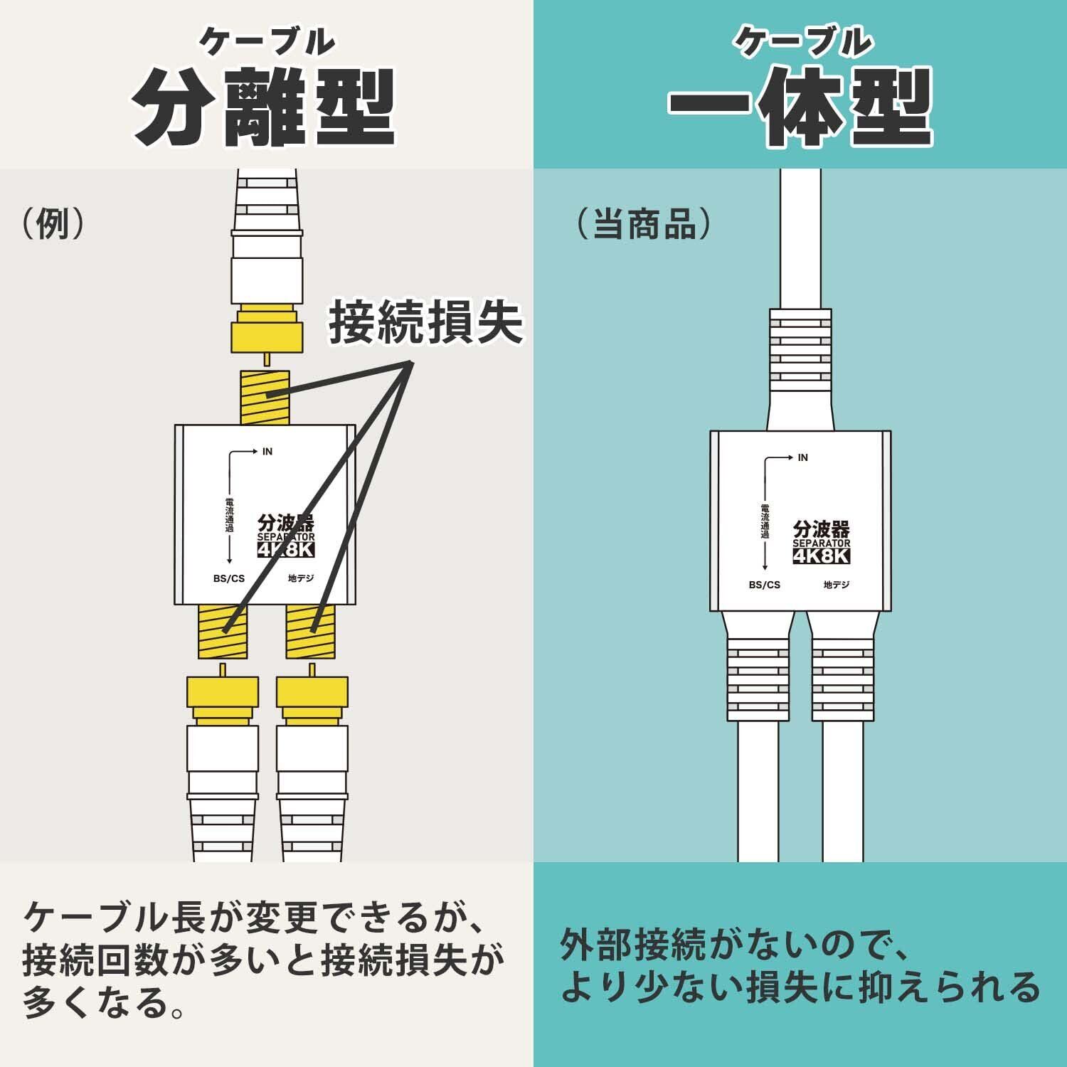 ■地デジ放送、BS/CS放送をそれぞれ視聴したいときはコレ! 地上波(UHF)と衛星波(BS/110度CS)を効率よく分け、1台のテレビで地デジ、BS、110度CS放送を視聴できます。 ■新4K8K衛星放送対応 従来の地デジ、BS、110度CS放送に加えて、最新の4K/8K放送にも対応しています。 ■ケーブル一体型構造 分波器本体と入力・出力側ケーブルが一体型のつくりになっているため、分離型に比べて接続損失を軽減することが可能です。 ■BSアンテナ電源供給可能