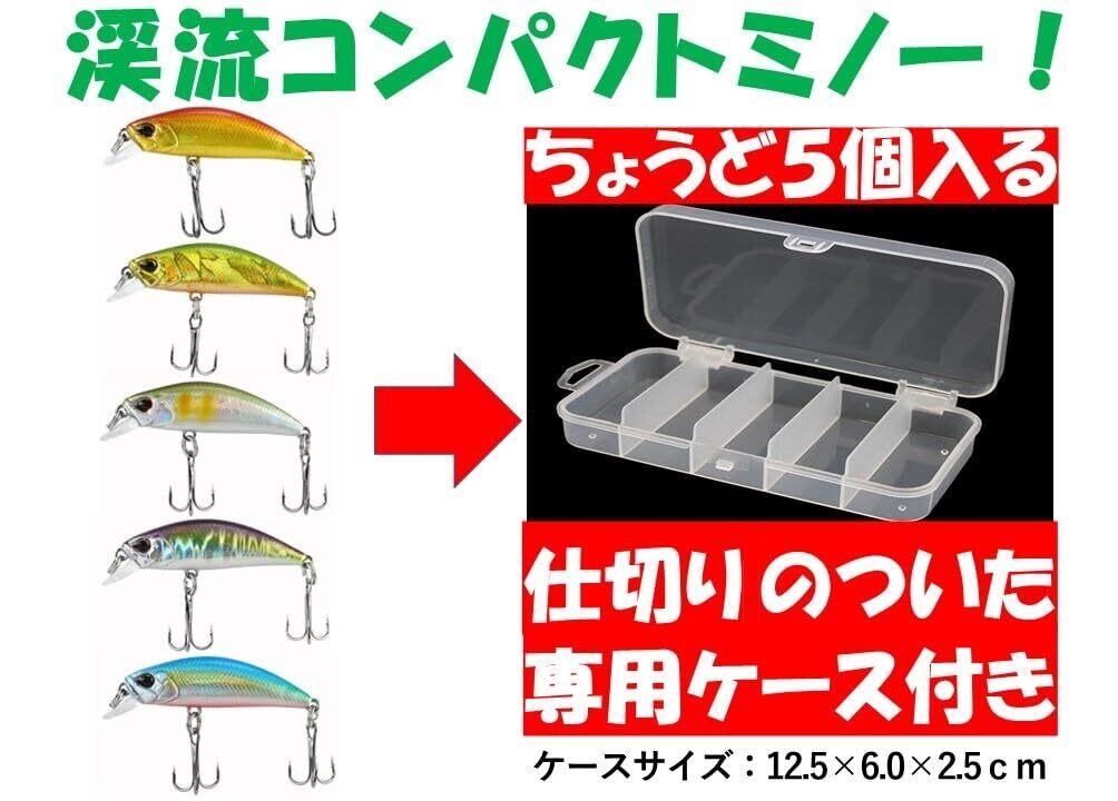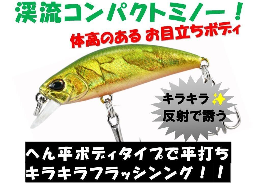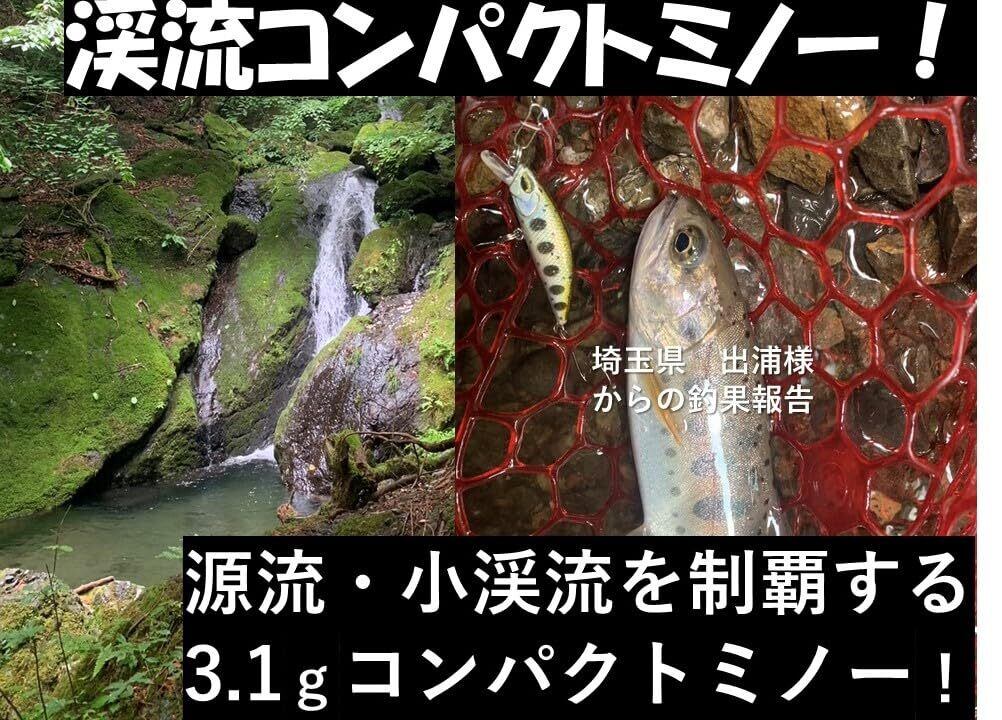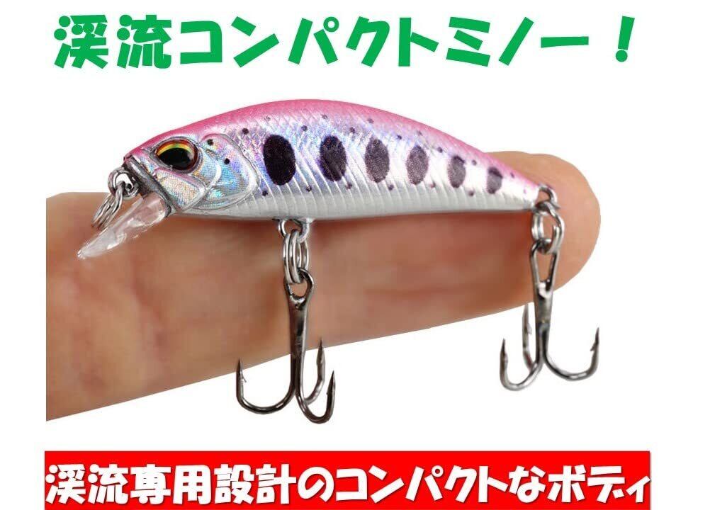 特徴:渓流専用設計コンパクトボディで、川幅の狭い小渓流でも扱いやすいミノー! また海で数釣りするのに丁度よいサイズ!