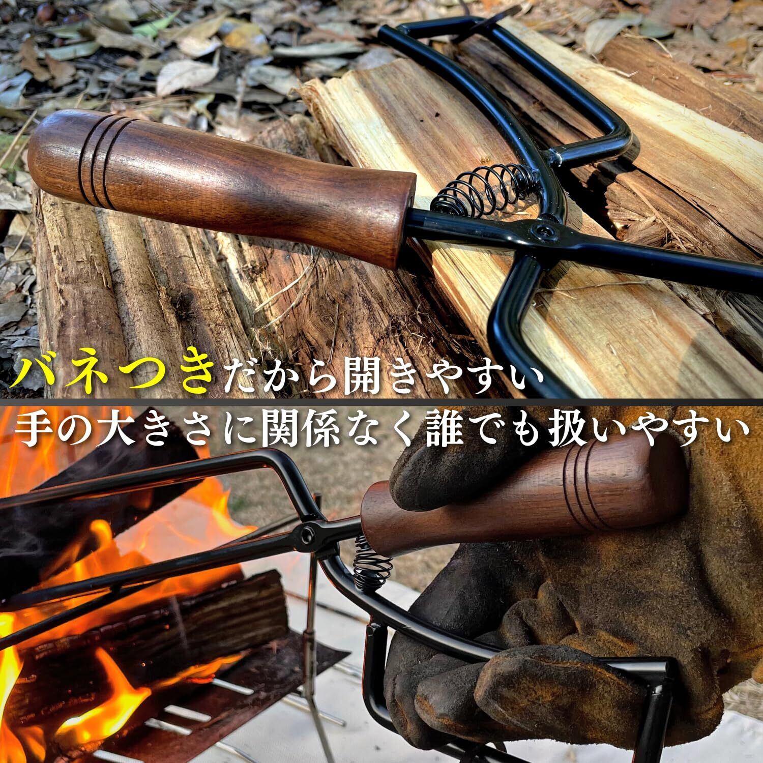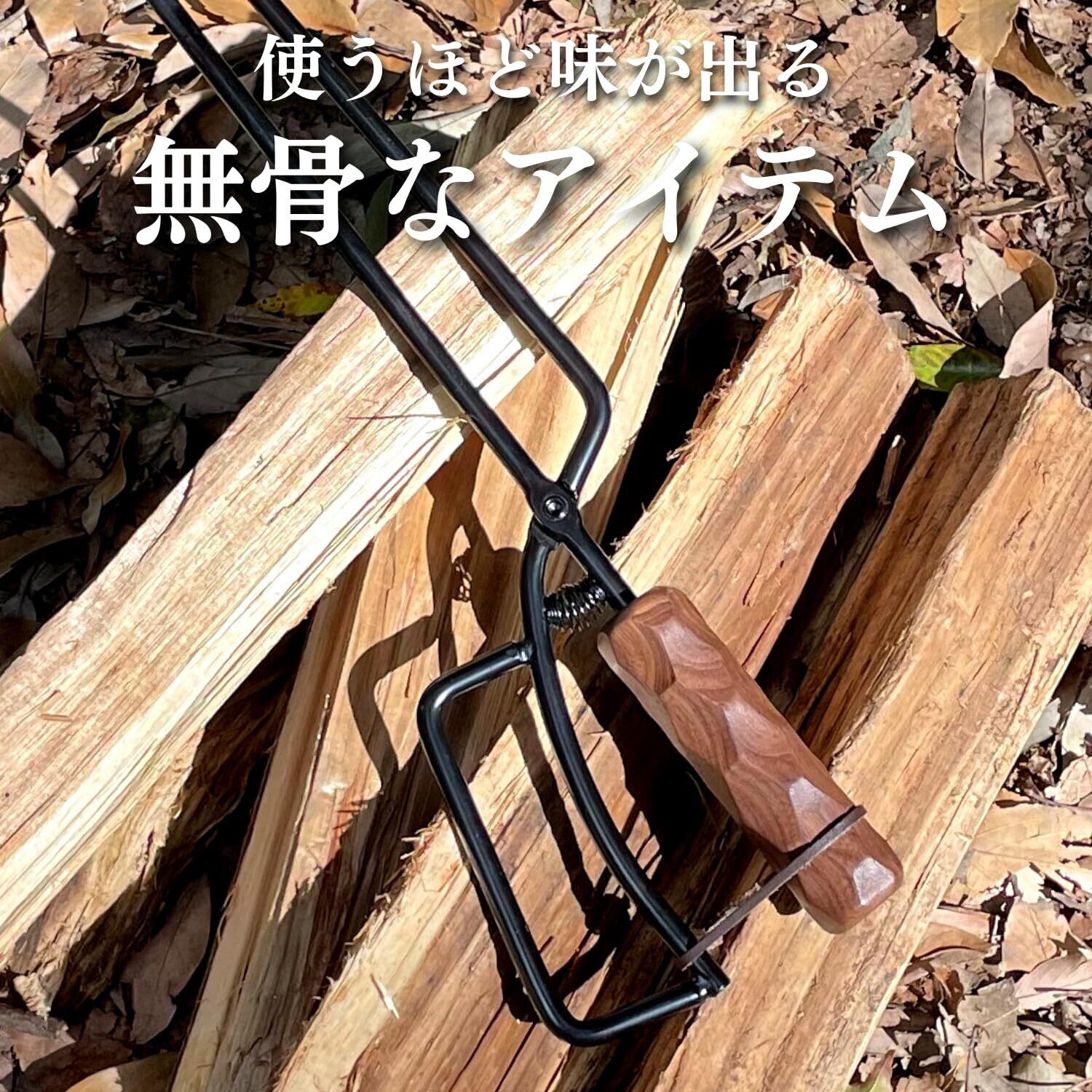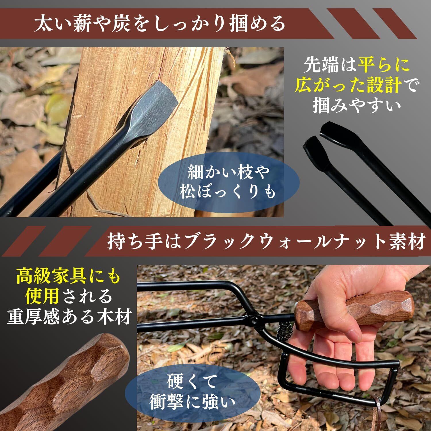 【日本ブランド】LUHANA 火バサミ 薪バサミ バネ付き 焚き火 トング 炭 キャンプ 力不要 女性でも簡単 (名栗加工ブラックウォールナット)