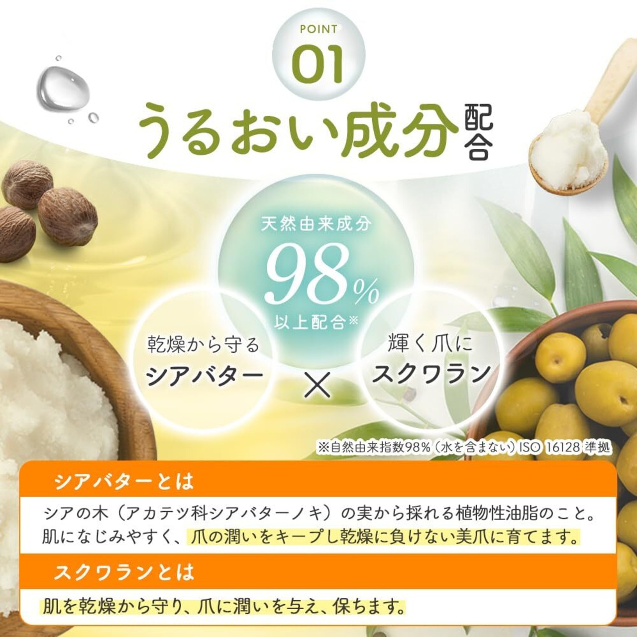 【シアバター&スクワランが99.9%配合】爪に優しいネイルケアオイル。二枚爪・薄い爪・ささくれをしっかり保護!大事な爪をケアし、程よくしっとり保湿します。甘皮ケア・爪の補強・補修・強化・キューティクルオイルとして。