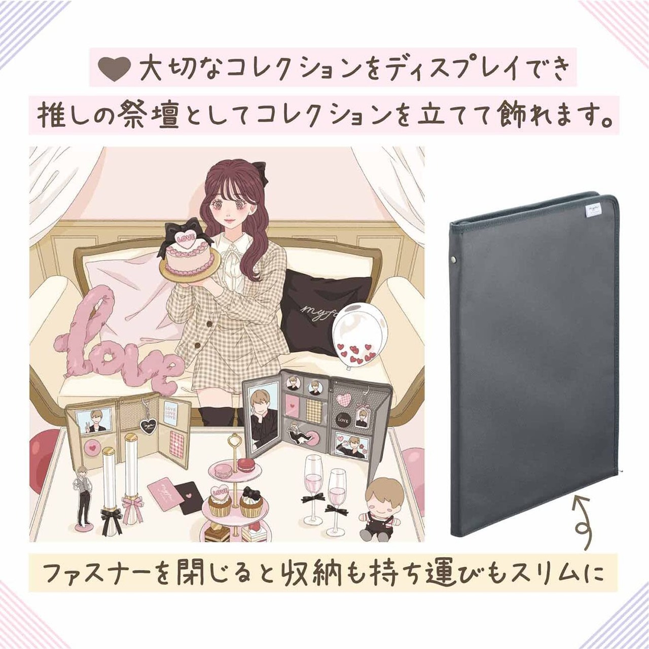 推しの祭壇としてコレクションを立てて飾れます。収納物のとび出しを防ぐフラップ付き。