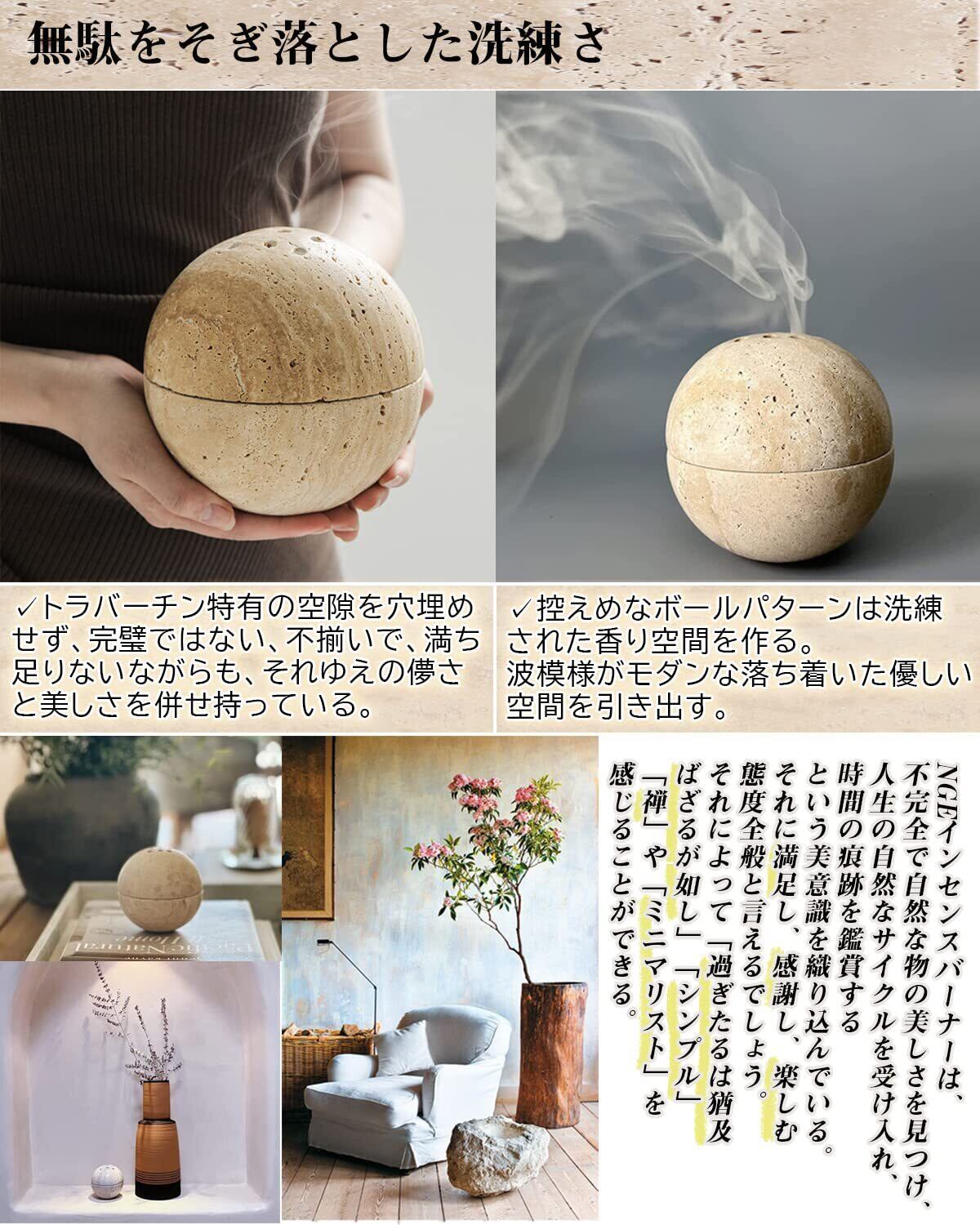 【わびさび風のインテリアに】NGEお香立ては、バウハウスデザインのように無駄をそぎ落とした洗練さをもち、心の暖かさと安心感を放つ、どこか哲学的なお香置きです。高品質の大理石の自然素材は、和風・洋風としても相性が良く、素朴な雰囲気が出せる。「水磨き」、マットにすることで柔らかい印象を与えることができる。トラバーチン特有の空隙を穴埋めせず、満ち足りないながらも、それゆえの儚さと美しさを併せ持っている。控えめなボールパターンは洗練された香り空間を作る。波模様が木目のようにも見え、モダンな落ち着いた空間を引き出す。ベージュの色合いが、平和と調和を生み出し、温もりのある安らげる室内にしてくれる。