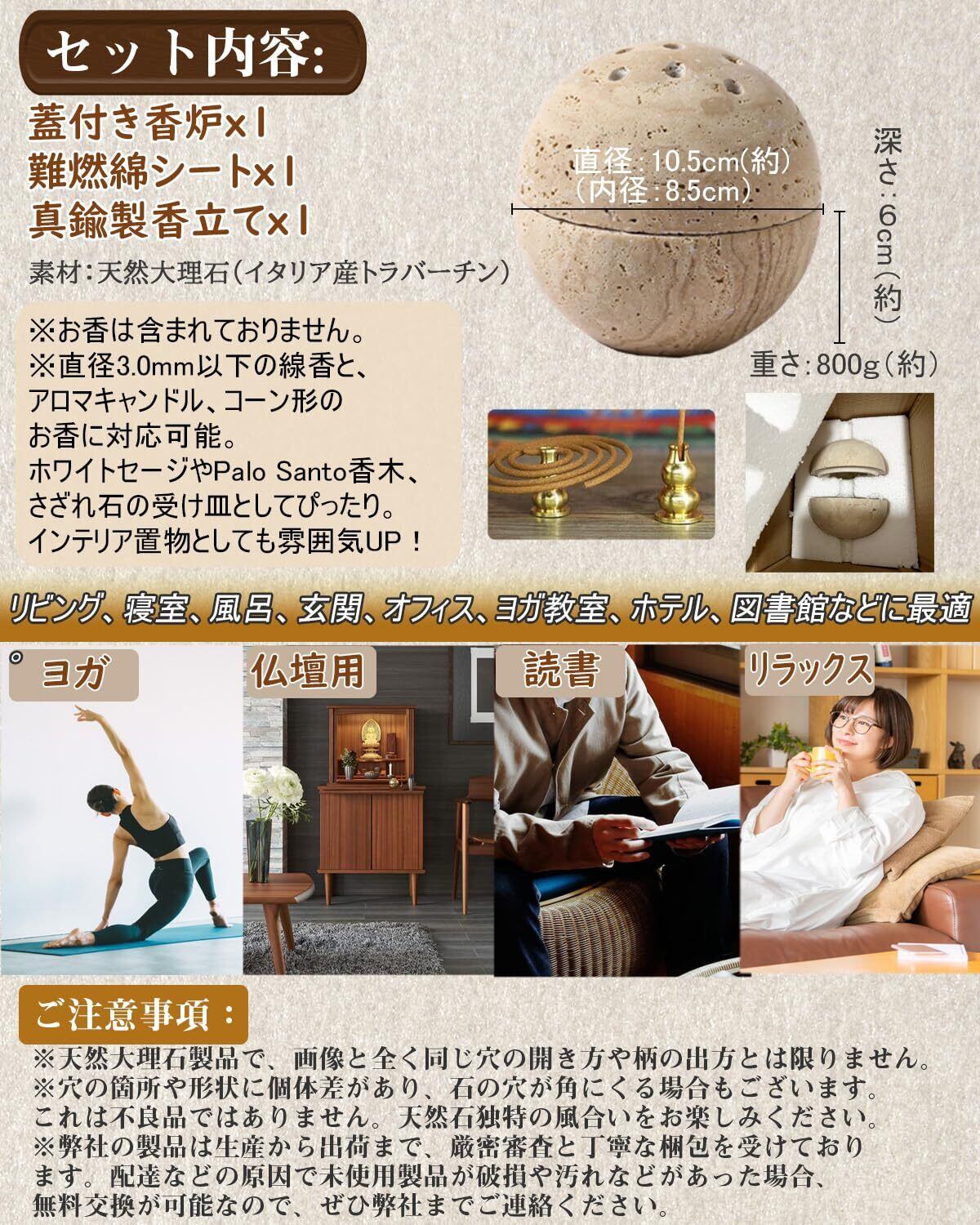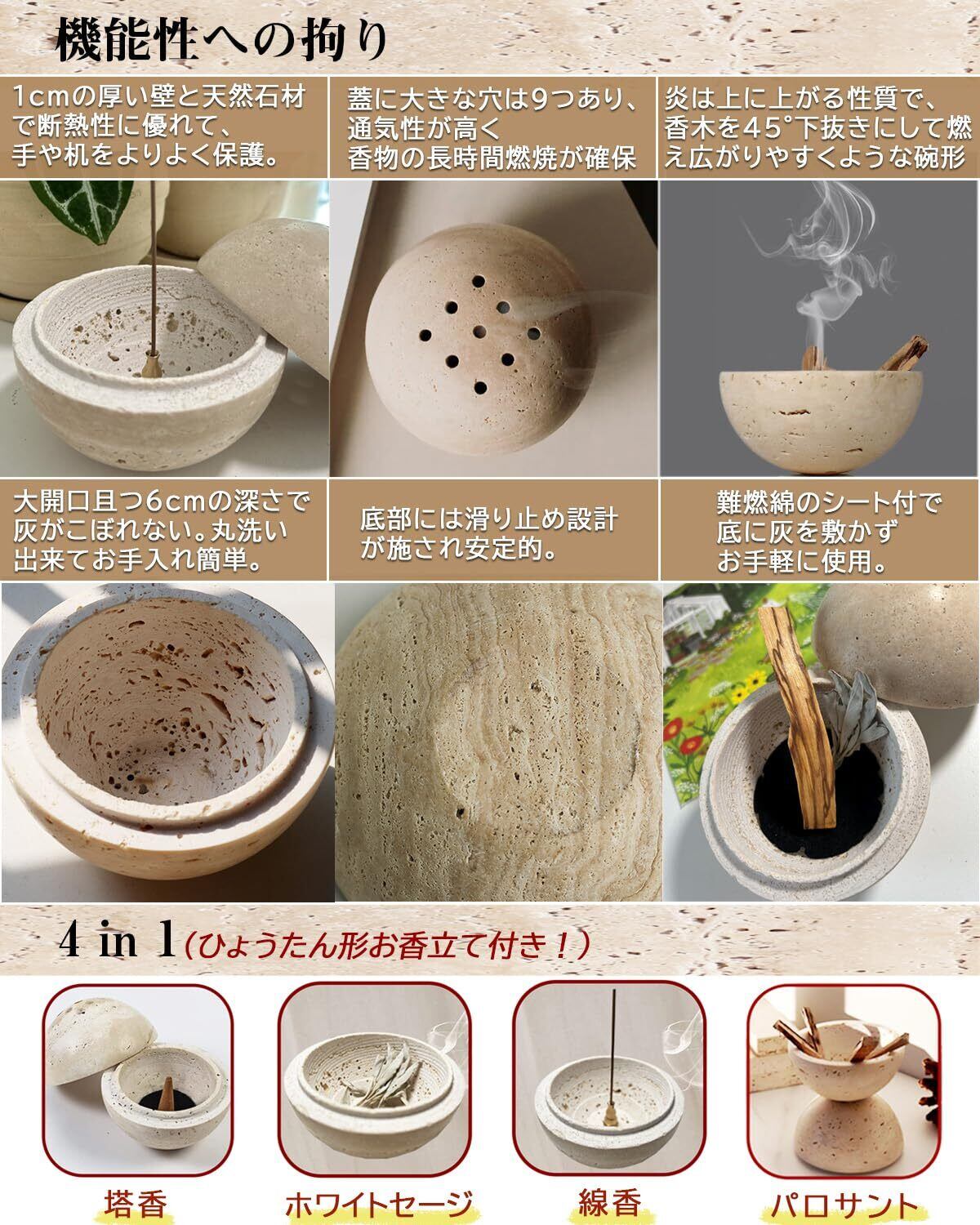 【機能面にも拘り】◎陶器よりも高い耐熱性、触感はひんやりとしている。1cmの厚い壁で、手や机をよりよく保護。天然素材で長時間変質しにくく、経年変化を楽しめる。 ◎蓋付きかつ6cmの深さもあり灰の舞い上がりもない。スティックを下抜きにできる碗型で燃えやすい。◎底部には滑り止め設計が施され安定的。 ◎蓋に大きな穴は9つあり、通気性が高く香物の長時間燃焼が確保。 ◎難燃綿のシート付で底に灰を敷かずお手軽に使用。◎大開口(直径約10.5cm、内径約8cm)で長めの線香の灰が容器からこぼれない。丸洗い出来てお手入れ簡単。