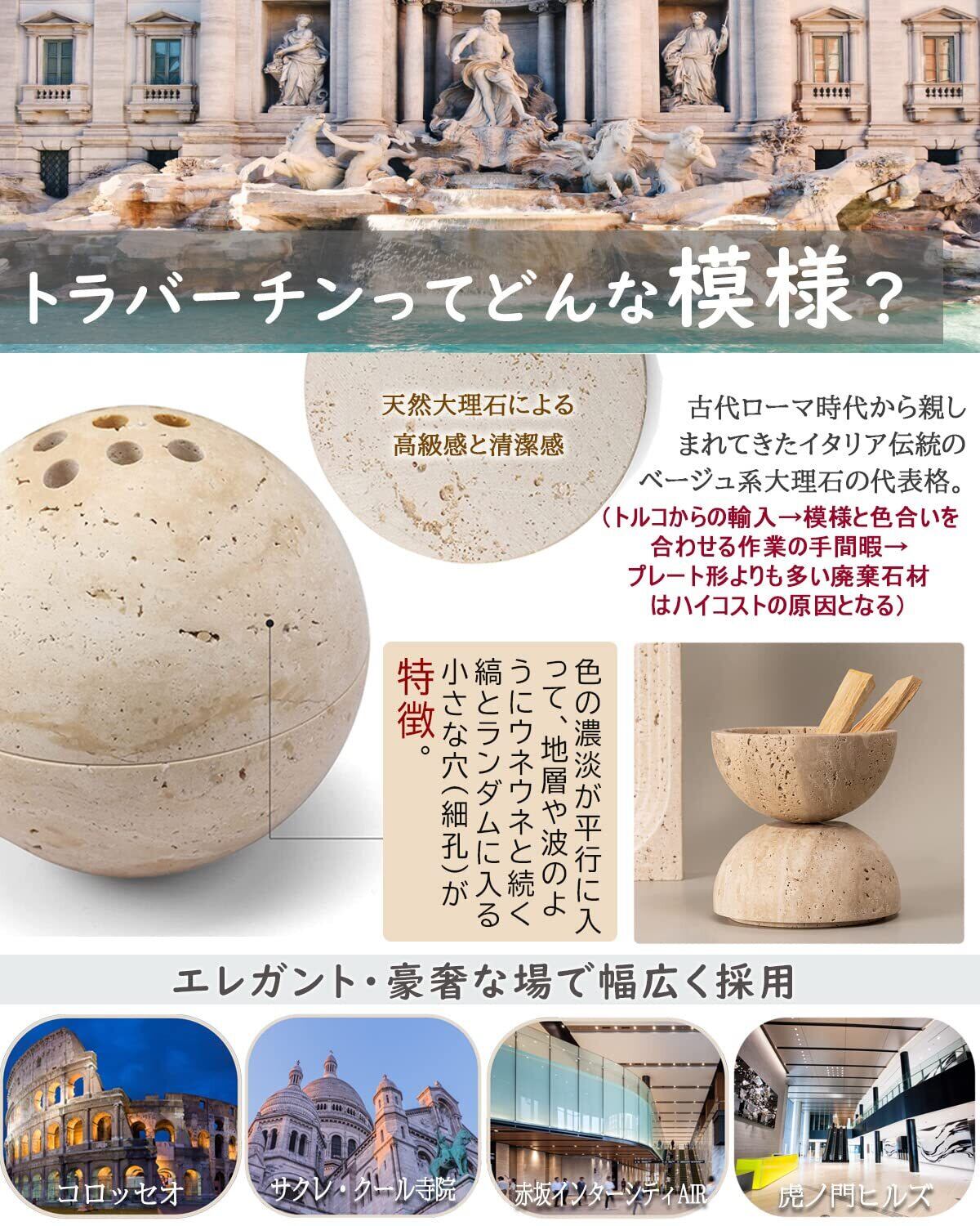 商標(第2024-062966号)登録済みです。【天然大理石製】 NGE香炉は100%イタリアのトラバーチン(ベージュの大理石)で作られ、地層や海のさざ波のようにウネウネと続く縞模様が特徴。ローマのコロッセオ、虎ノ門ヒルズなどエレガントな場に幅広く採用。イタリア原石輸入の運送費、大理石の特性と模様にも拘りで加工中に使え部分が多く、値段も高くなっていく。しかし自然の模様や質感、石それぞれの個性がおしゃれで、格調があるのでとても人気。生成には数億年の長い年月が必要で、太古の時の流れに思いを馳せるロマンもある。高級感と清潔感を感じさせる事ができる。