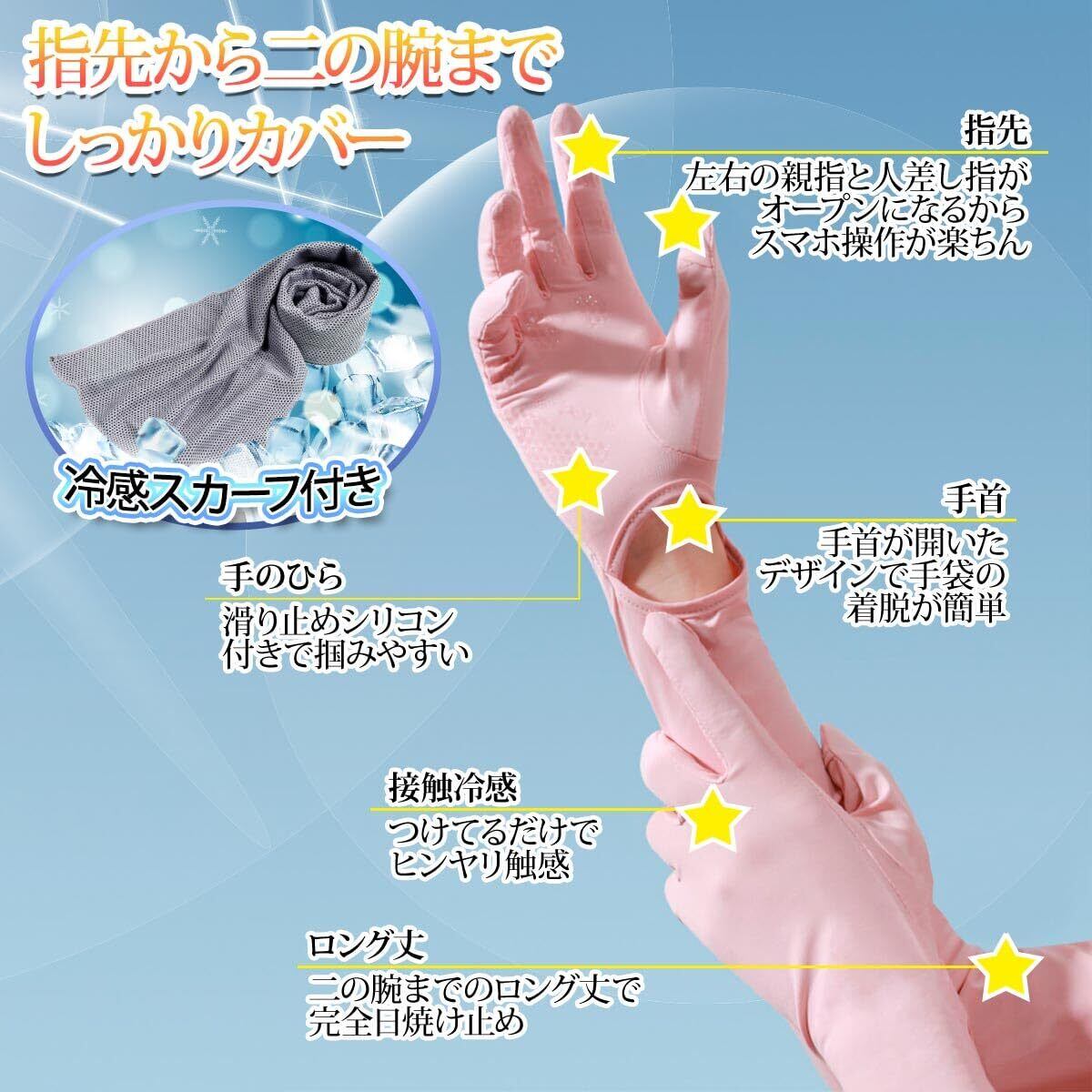 【UV対策と一緒に使える「冷感スカーフ」付き】サイズ:80×15cm。水に浸して振るだけでひんやり快適。 【指先までしっかり日焼け止め】 絶対に日焼けしたくない人におすすめ。指先までしっかり日焼け止めができます。指先~手のひら~肩下までしっかり覆えるロング丈なので、Tシャツと合わせて腕全体の日焼け対策が簡単にできます。