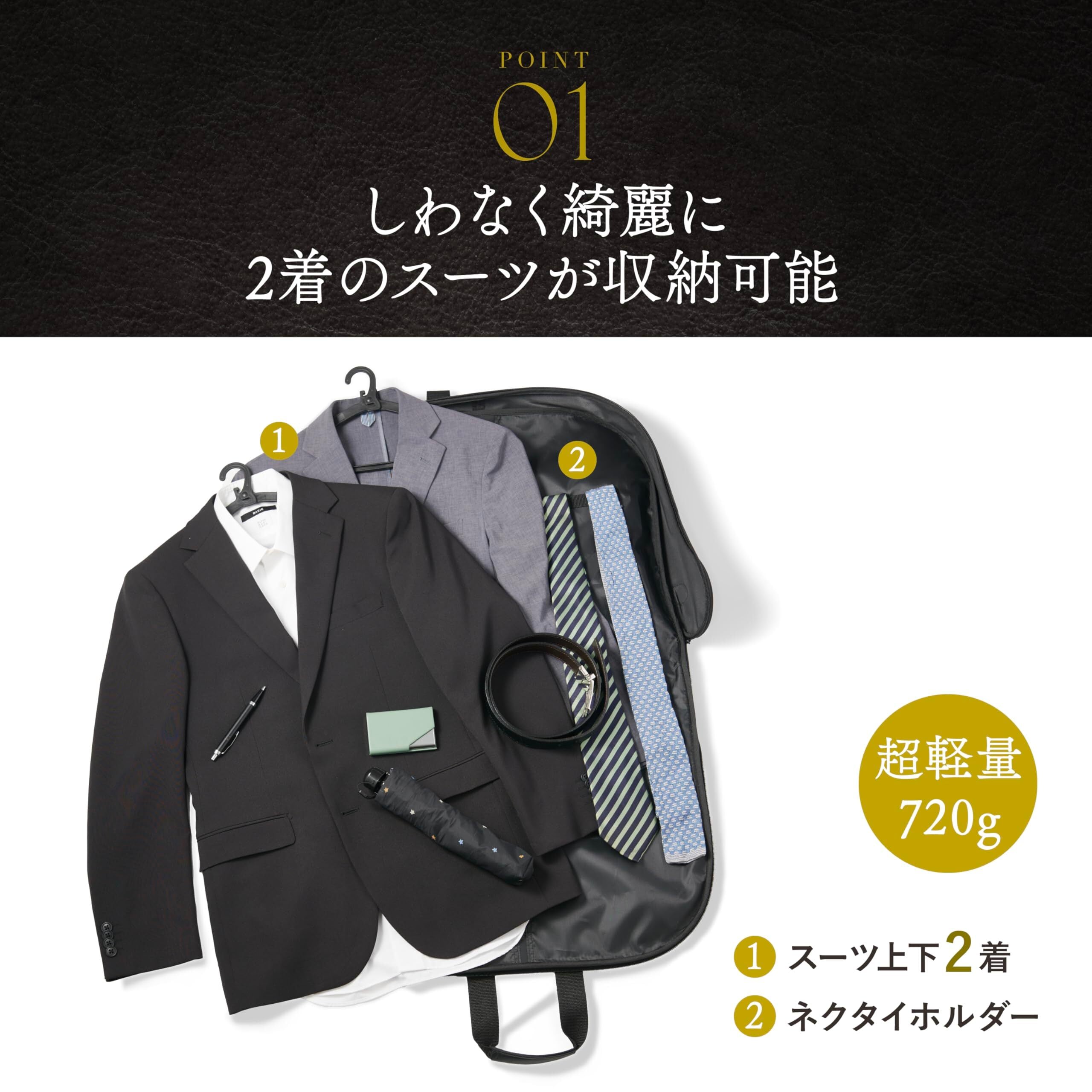 ■【出張の多いビジネスマンを助ける一品】 スーツにしわをつけることなく運ぶために必要なガーメントバッグ、出張や冠婚葬祭など、スーツを持ち運ぶ機会の多いビジネスマンにとっては必需品といえる。このガーメントバッグなら、すべてのビジネスウェアをひとつに収納できるから、何かと忙しいビジネスマンにとって、頼もしい相棒となるだろう。このバッグひとつでスーツ、ワイシャツ、靴下、ネクタイ、折りたたみ傘などをまとめて収納できる。長めの出張や冠婚葬祭の場合、スーツが一着だと、どうしても不安になる。だからこそ、できるビジネスマンはガーメントバッグを用意し、替えのスーツを用意するのだ。このバッグがあれば、スーツがしわになりこともなく、常に新鮮な状態で運べる。忙しいビジネスマンは必携の逸品だ。