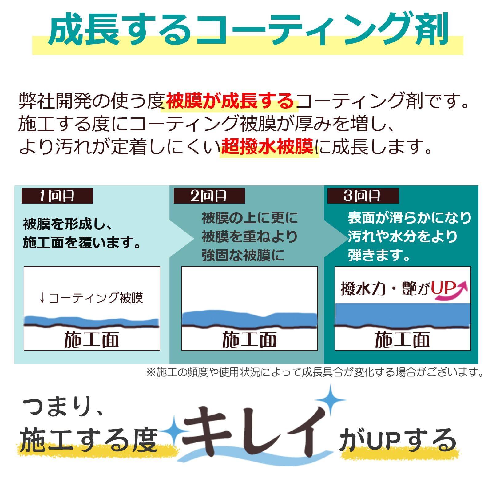 【ガラスコーティングクラスの高耐久】通常の艶出し剤とは異なり、ガラス被膜のような透明層が形成され、長時間の保護力を発揮。プロ仕様の仕上がりをご家庭でも。