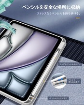 「スタンド機能」人間工学に基づくスタンド角度です。鑑賞モード65°で置いた際には、映画やウェブを楽しむことができます。タイピングモード30°で置いた際には、快適な文字入力も可能です。動画視聴とタイピングの2つのアングルで使えて、お好きな角度でiPadを楽しむことができます。アップルペンシル収納用のスロットも設計してあり、ApplePencil USB-C(iPad Air 11インチM3 M2用)の磁気吸着、Pencil Pro(iPad Air 11インチM3 M2用)及び ApplePencil第2世代(iPad Air 第5世代/第4世代 10.9インチ用)のワイヤレス充電に対応でき、より快適にご利用いただけます。