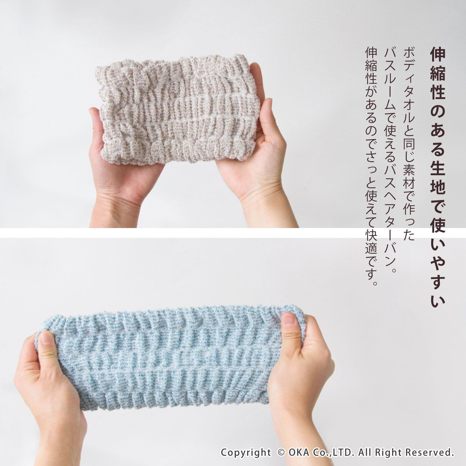 例えば、入浴中の洗顔時に顔に掛かる髪をさっとまとめたり、シャンプー後のトリートメントをしっかり浸透させたいな、という時に蒸しタオルの代わりに使ったり、と、いつものバスタイムがちょっとだけ快適になるターバンです。