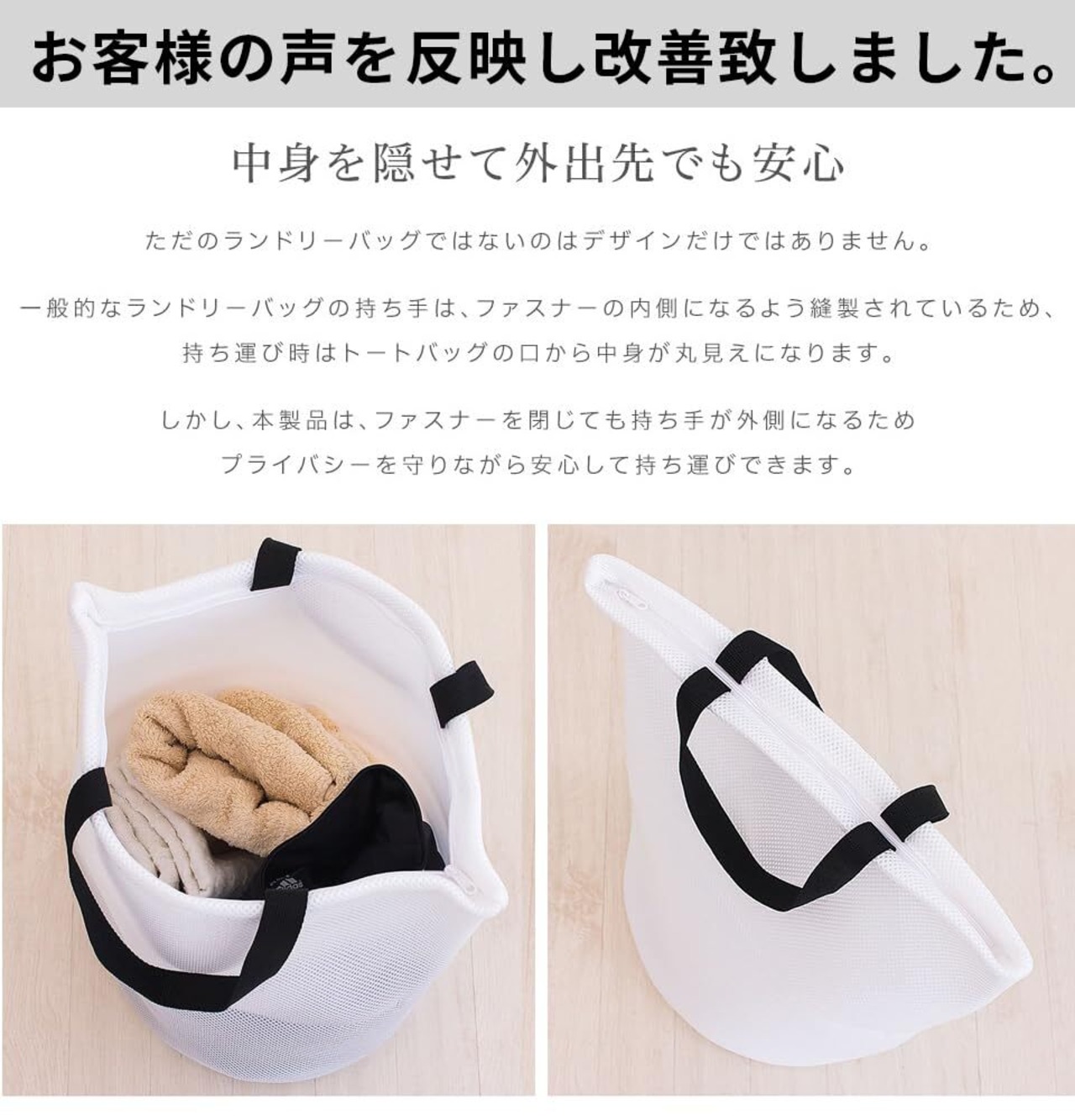 メッシュ生地は中身の洗濯物が見えにくいダブルメッシュ仕様で外出にも使用できます。