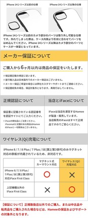 ●本製品ご使用における人体・スマートフォン本体を含む持ち物・データなどの損傷、損失、紛失に対し、弊社は一切の責任を負いかねます。●スマートフォン本体やケースに発熱などの異常がある場合は本製品を外してください。●画面保護フィルムの形状により本製品と併用できない場合があります。●背面カメラでの撮影時に写り込みが起こる場合があります。●ご使用の充電器や環境によってワイヤレス充電がご利用いただけない場合があります。●ご利用状況・環境、溶剤の使用などにより変色や変質が起きることがあります。●本製品装着やOSアップデートにより、スマートフォンの一部機能が使えなくなる可能性があります。●本製品およびパッケージは改良のため予告なく仕様を変更する場合があります。●記載されている製品名・会社名などは各社の商標または登録商標です。●使用している表面素材の特性上、爪やアクセサリーなどの先の尖った物によってケース表面に傷が付くことがあります。