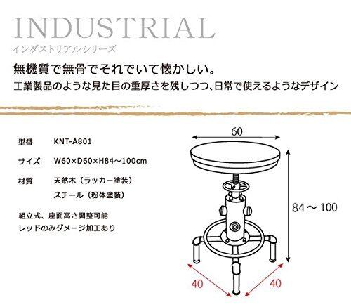 テーブル/センターテーブル バーテーブル INDUSTRIAL 天板高さ調整可能 KNT-A801 レッド色※無機質で無骨な重厚さと懐かしさが魅力のバーテーブル※工業製品のような重厚さを活かしつつ、日常で使えるようにデザインされた「INDUSTRIAL(インダストリアル)」シリーズのバーテーブルです。素材にもこだわっているので丈夫で長くお使いいただけます。高さを84~100cmで昇降できるので座る人やチェアの高さに合わせて簡単に調節可能です。男前家具 塩系インテリア※男前家具、塩系インテリア、男気家具、インダストリアルシリーズ。ご注文いただいてから1日~2日(土日祝除く)での発送となります◆サイズ:幅60×奥行き60×高さ79~100cm◆材質:天然木(ラッカー塗装)、スチール(粉体塗装)◆組立式、天板高さ調整可能、レッドのみダメージ加工あり◇このシリーズはブラック色とレッド色の販売がございます◇セットできるチェアの販売もございます。