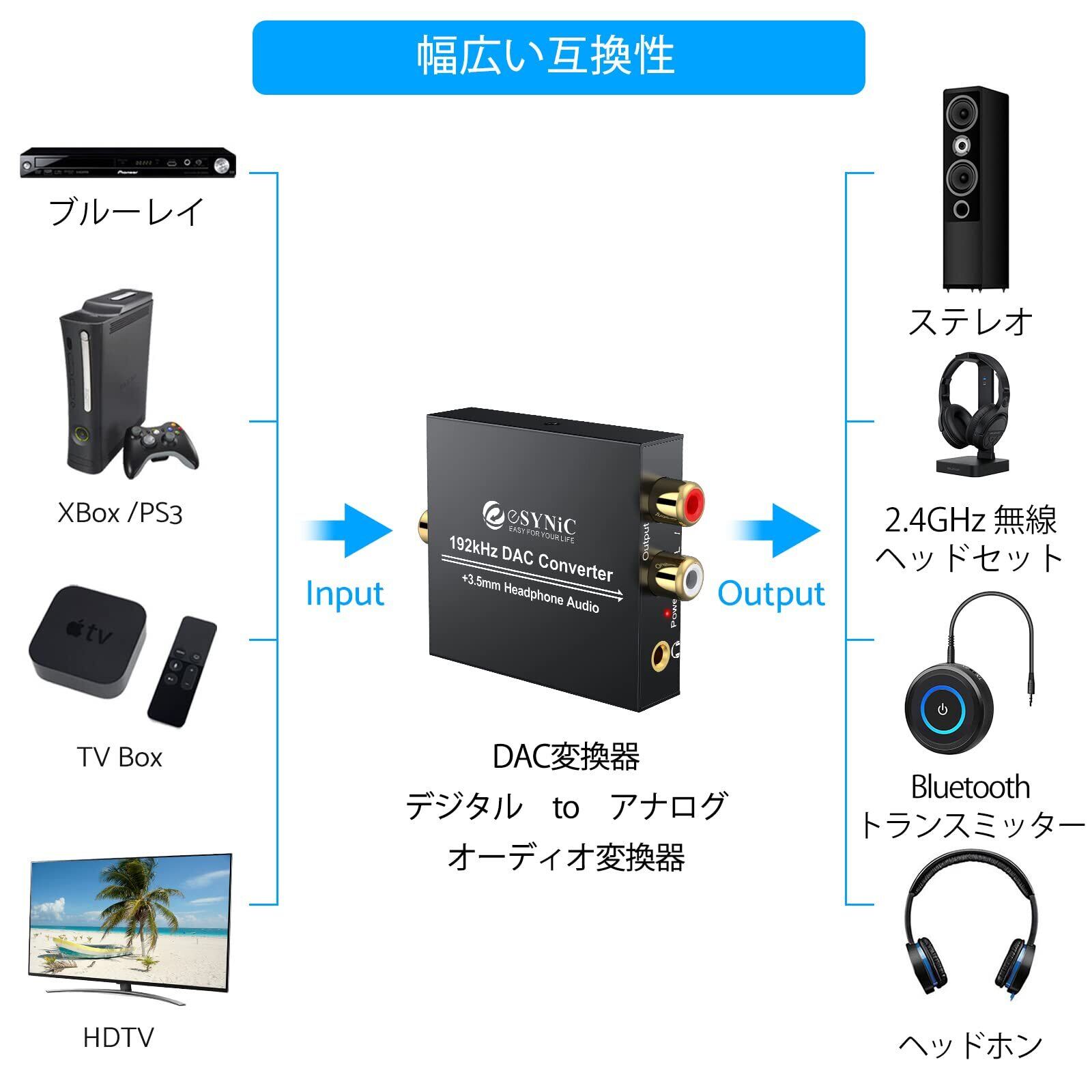 eSynic 192KHzデジタル アナログ変換器 DAC オーディオ変換器トスリンク光 同軸デジタル信号入力 RCAアナログ 3.5mmミニジャック出力 PS4 XBox HD DVDなど対応 (Digital/Coaxial/Toslink to Analog)
