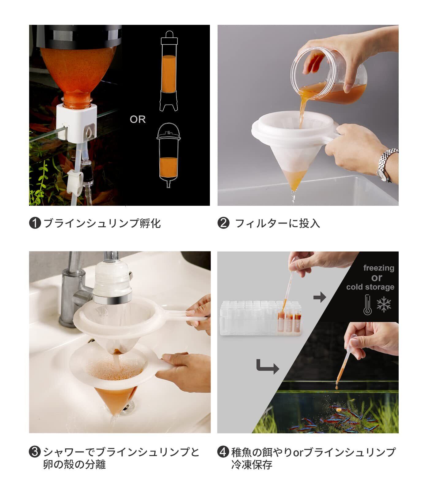 使い方:24時間で孵化後ブラインシュリンプを分離でき、80目と200目2種セットです。卵:テトラ (Tetra) ブラインシュリンプエッグス、大卵におすすめます。