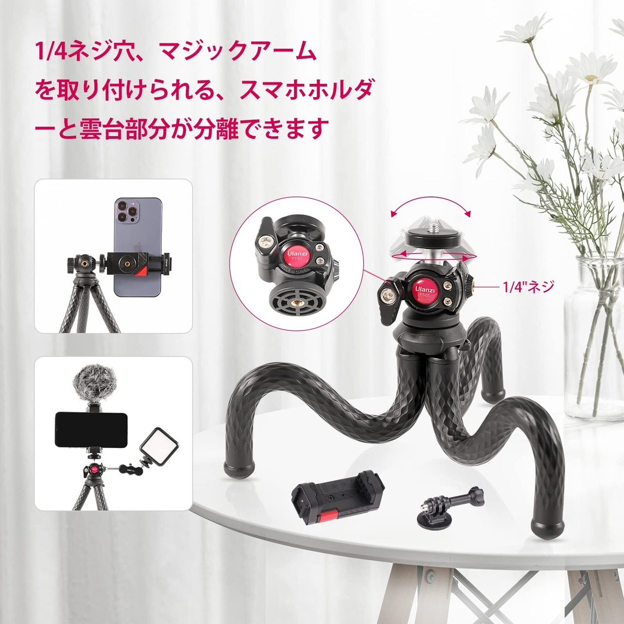 【数量限定】ULANZI スマホ 三脚スタンド くねくね フレキシブル三脚 スマホホルダー付き、Gopro用マウント付き 自由雲台 360度回転 1/4インチネジ スマホスタンド三脚 ミニ三脚 iPhone/Android/GoPro/デジカメ/ビデオカメラ/プロジェクター/自撮り/写真撮影などに対応 | ニコニコSHOP
