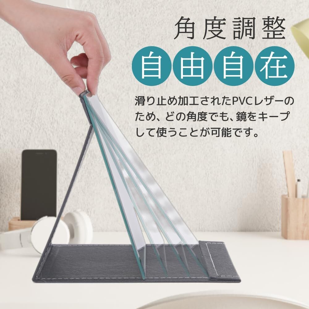 卓上鏡 鏡大 Lサイズ 大きな鏡 21cm*15.5cm 卓上 ミラー 化粧鏡 折り畳みミラー コンパクト 自立式 角度調整可能 上質PUレザー ブラック 置き鏡