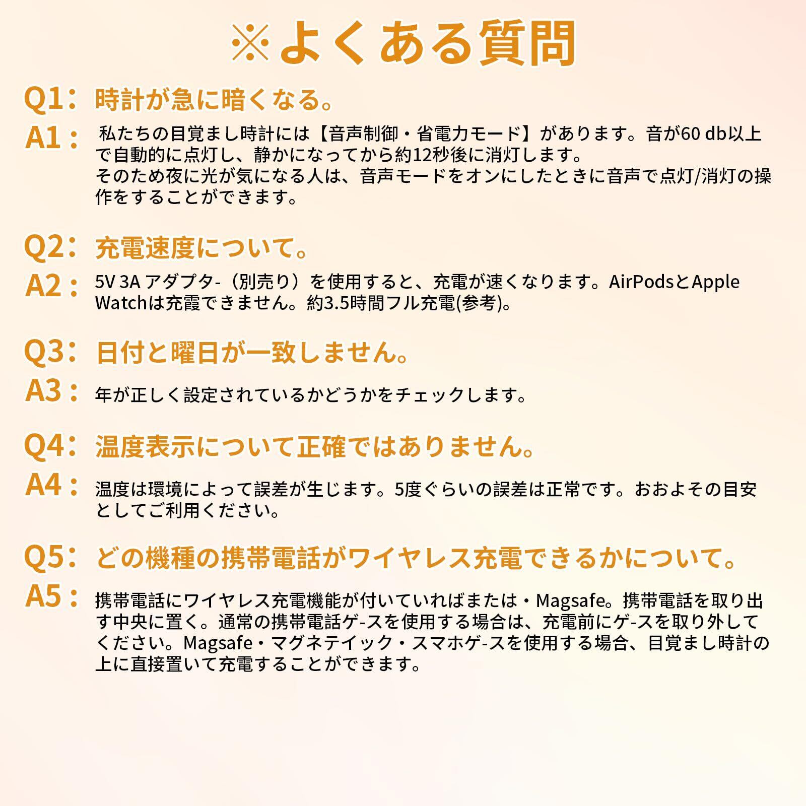 【QIワイヤレス携帯充電】QI受電技術を搭載したワイヤレス目覚まし時計で、本体に置くだけでQI対応端末やQI対応カバー付きスマートフォンを充電できます。 注: ご購入の前に、お使いのスマートフォンが QIワイヤレス充電機能に対応しているかどうかを確認してください。 USBケーブルを接続することでQiワイヤレス充電機能に対応。 5V 2A以上のアダプタを購入する必要があります,5V 3A アダプター (別売り) を使用すると、充電が速くなります。(Qi ワイヤレス充電シリアル番号: LZX01022。)