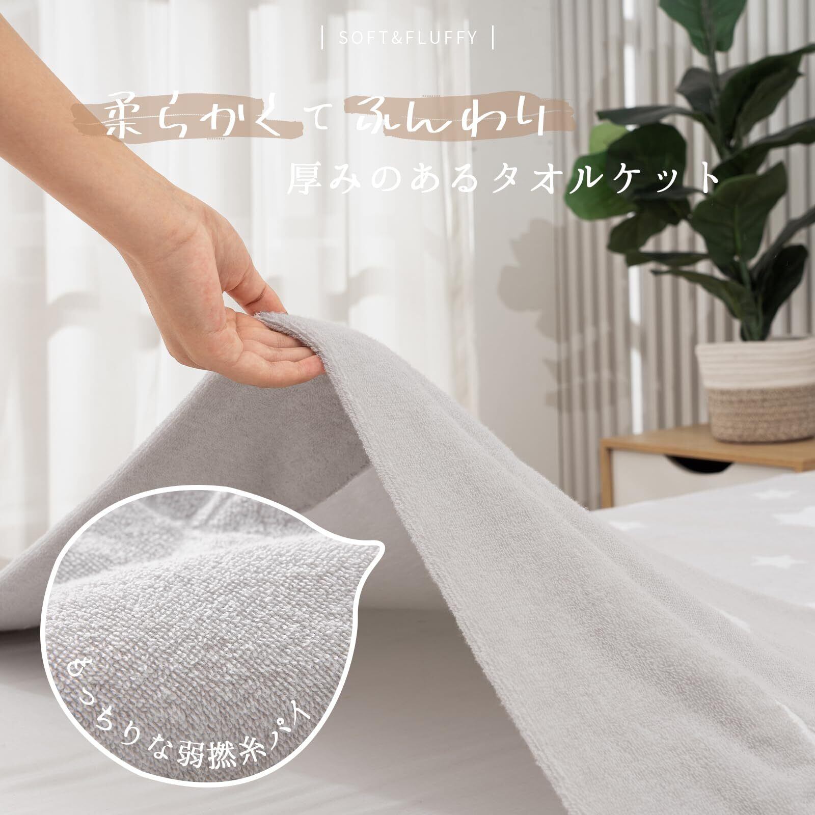 【いつもサラッと快適】吸水性・吸湿性に優れたタオルケットは、汗や湿気を素早くしっかりと吸収してくれます。梅雨のジメジメでも夏のムシムシでも、サラッとしてベタつきにくく、朝までぐっすり眠り、寝起きも爽快です。ほどよい厚みで暑いとは感じてません、癒されるふわっとした肌触りが気持ちいいです。