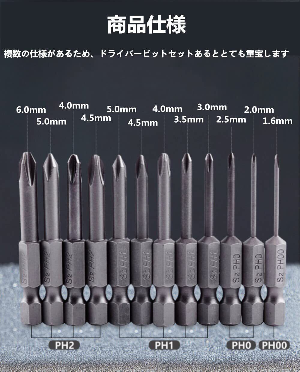 【セット内容】ドライバービットセット 12本セット。全長さ:50mm ,軸径:6.35mm六角軸(1/4インチ),モデルPH00、PH0、PH1、PH2。