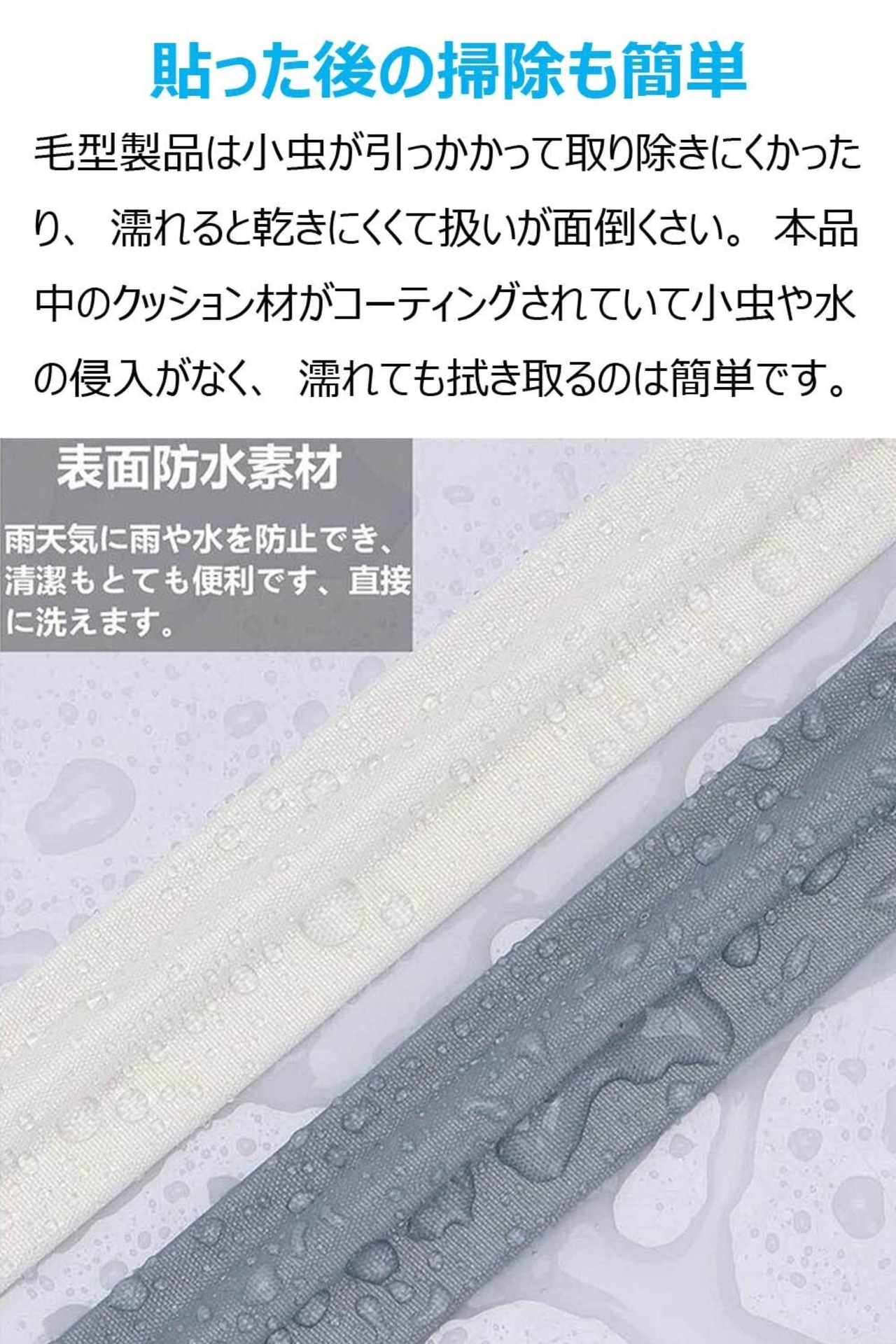 貼った後の掃除も簡単:毛型製品は小虫が引っかかって取り除きにくかったり、濡れると乾きにくくて扱いが面倒くさい。本品中のクッション材がコーティングされていて小虫や水の侵入がなく、濡れても拭き取るのは簡単です。