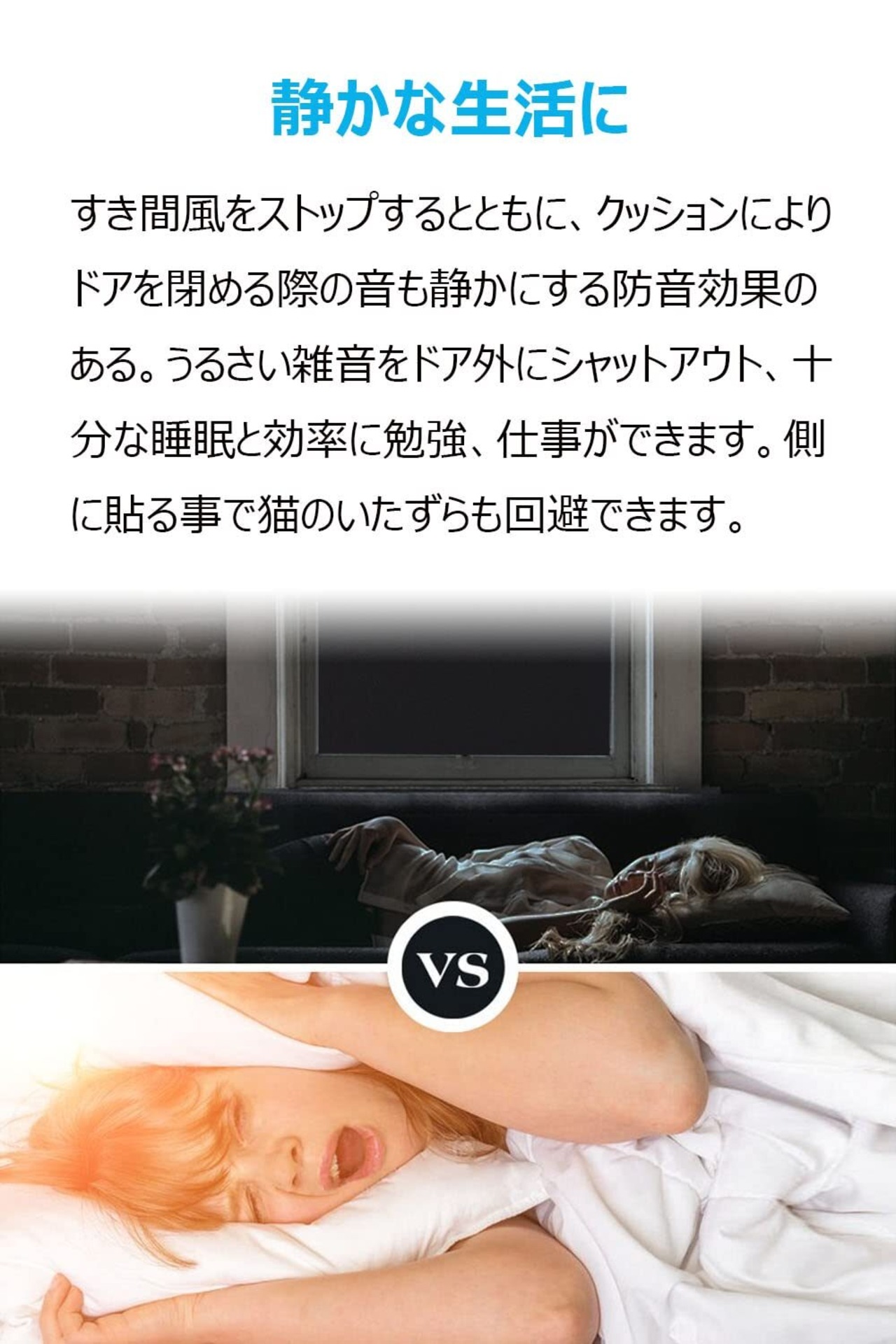 隙間風防止:PUフォームをナイロンで包んだサンドウィッチ構造、空気層のように断熱できます。隙間を埋めて、スキマ風の流入が大幅に減ります。強風でのガタガタ異音、隙間から入ってくる光と花粉、虫の侵入も解消できます。