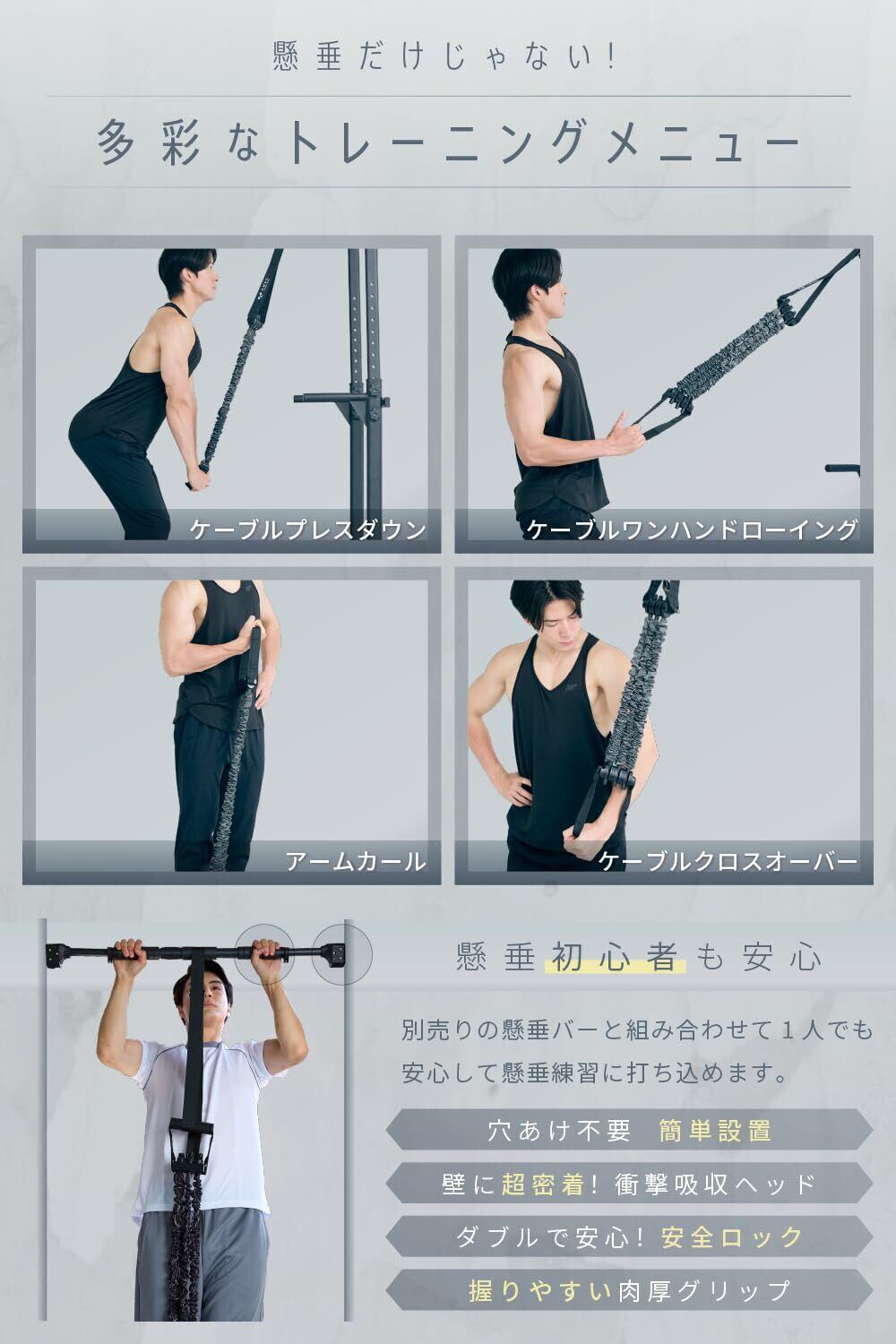 【懸垂補助に】3本のバンドが懸垂をサポート。初心者でも自宅で一人で懸垂トレーニングが可能です。