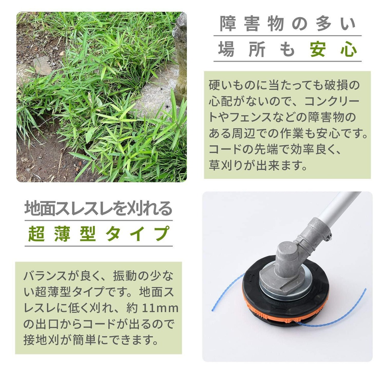 【特徴】分解なしで簡単にコードの交換が可能な自動繰り出しナイロンカッターです。23cc以上のエンジン式刈払機に使用できます。作業中ナイロンコードが短くなると自動的に繰り出されます。自動繰り出しされない場合は、一度回転を下げてアイドリング状態にし、再度回転を上げれば自動繰り出しが行われます。バランスが良く、振動の少ない超薄型タイプで地面スレスレに低く刈れ、約11mmの出口からコードが出るので接地刈が簡単にできます。硬いものに当たっても破損の心配がないので、コンクリートやフェンスなどの障害物のある周辺での作業も安心です。コードの先端で効率良く、草刈りが出来ます。部品が少なくシンプルな構造なので交換の手間がいらず故障しにくいです。