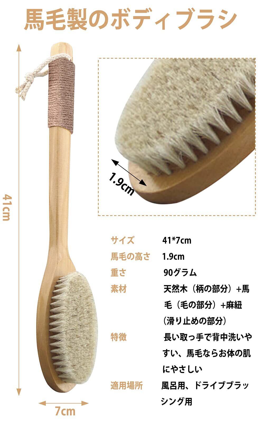 ✨「ボディブラシ 天然馬毛100%」:お肌にやさしい天然馬毛で作られ、豚毛よりも毛先が繊細で柔らかく、女性向けのボディブラシです。この製品があれば、ブラシが当たった皮膚に適度の刺激が残り痒みも落ち着き心地よさをご提供させていただきます。●お肌の弱い方、幼児、アレルギー体質の方、及び皮膚に異常のあるときはご使用をやめください。