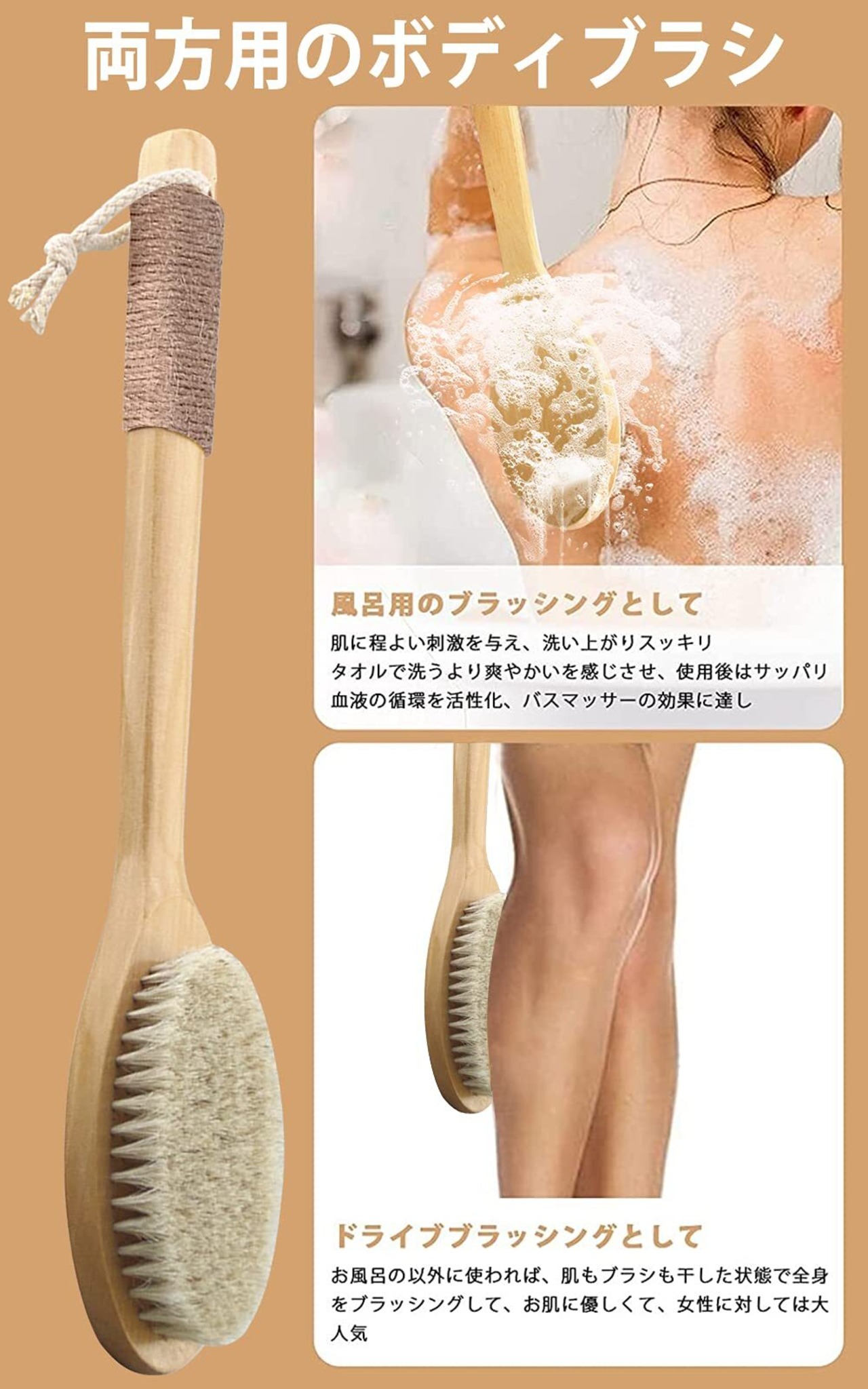✨「両方用のボディブラシ」:柔らかすぎず硬すぎず馬毛なので、風呂用またはドライブブラッシング用としてお使えていただきます。お風呂の最中に、背中をゴシゴシ洗いたい人や毛穴汚れをキレイにしたい方にオススメです。●肌もブラシも干した状態で全身をブラッシングして、お肌に優しくて、女性に対しては大人気です。