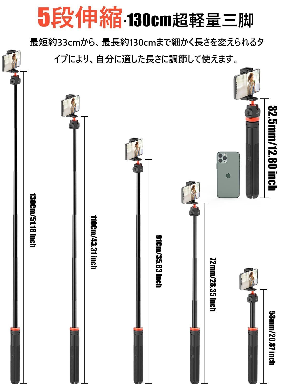 【5段伸縮&自由調節】スマホ 三脚32cm-130cmの5段伸縮、テーブルの上に置いて、ミニ三脚として使えるだけではありません。 また、拡張して床に置き、風景写真を撮ることもできます。 また、三脚を格納して自撮り棒としても使用できます。好みの長さに調整して、多用途に使用することができます。折り畳むとわずかの32cmまで、重さは396gの三脚はコンパクト、リュックに入るサイズなので、持ち運び便利です.