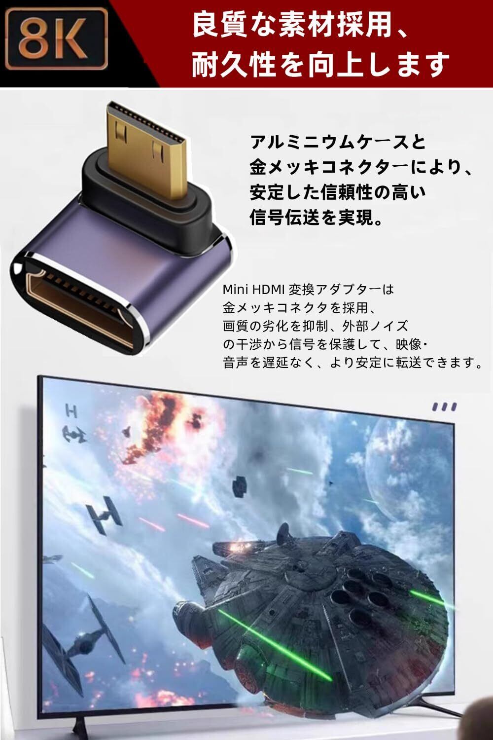 【使いやすい】コンパクトサイズの設計で使用と持ち運びに便利になります。簡単に挿抜できるのデザイン。挿すだけで接続完了、複雑な操作不要。Mini HDMI 変換アダプターは金メッキコネクタを採用、画質の劣化を抑制、外部ノイズの干渉から信号を保護して、映像・音声を遅延なく、より安定に転送できます