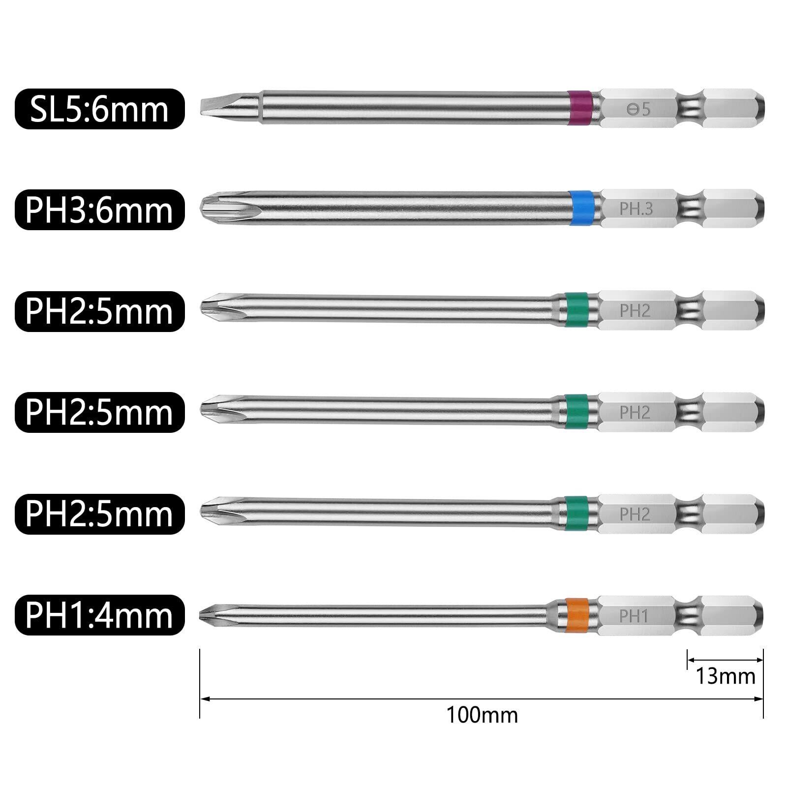 【商品仕様】サイズ:PH1x4mm(1本)、PH2x5mm(3本)、PH3x6mm(1本)、SL5x6mm(1本)。セット内容:6本組。全長さ:100mm。シャンク径:6.35mm。素材:クロムバナジウム鋼。硬度:HCR60±。