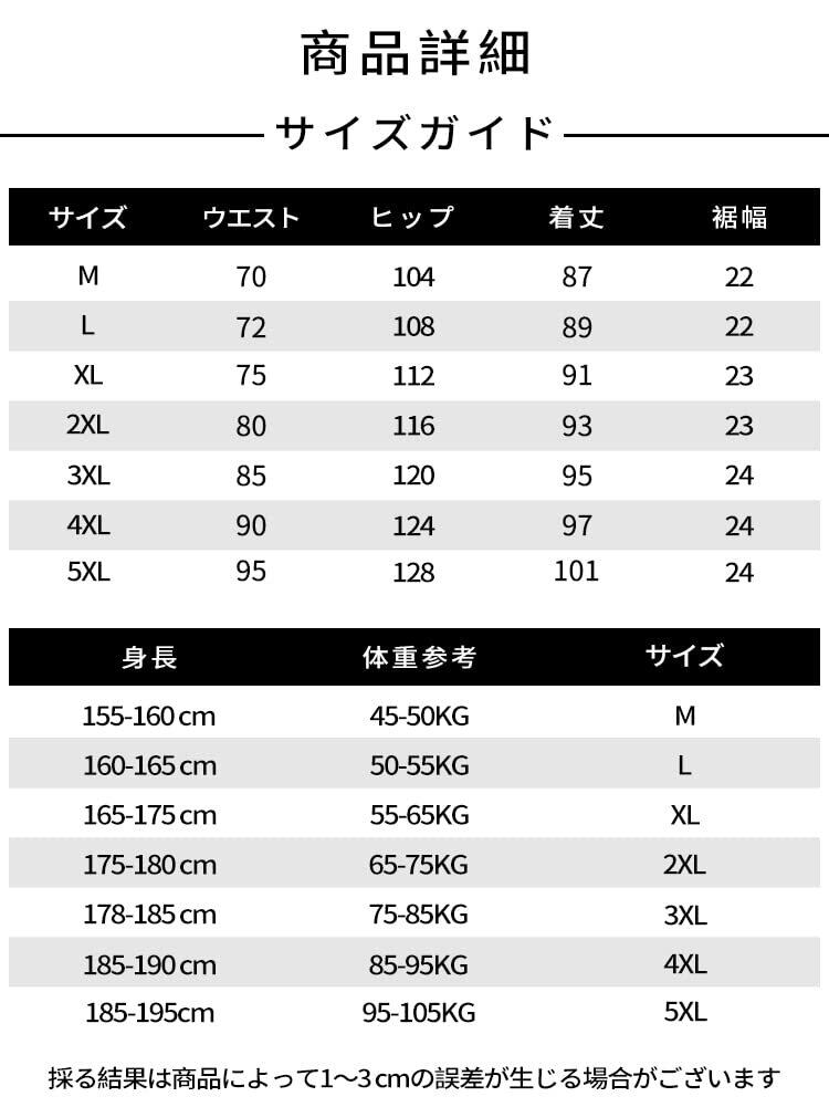 サイズ:4XL ウエスト:90cm ヒップ:124cm 着丈:97cm 裾幅:24cm サイズ:5XL ウエスト:95cm ヒップ:128cm 着丈:101cm 裾幅:24cm