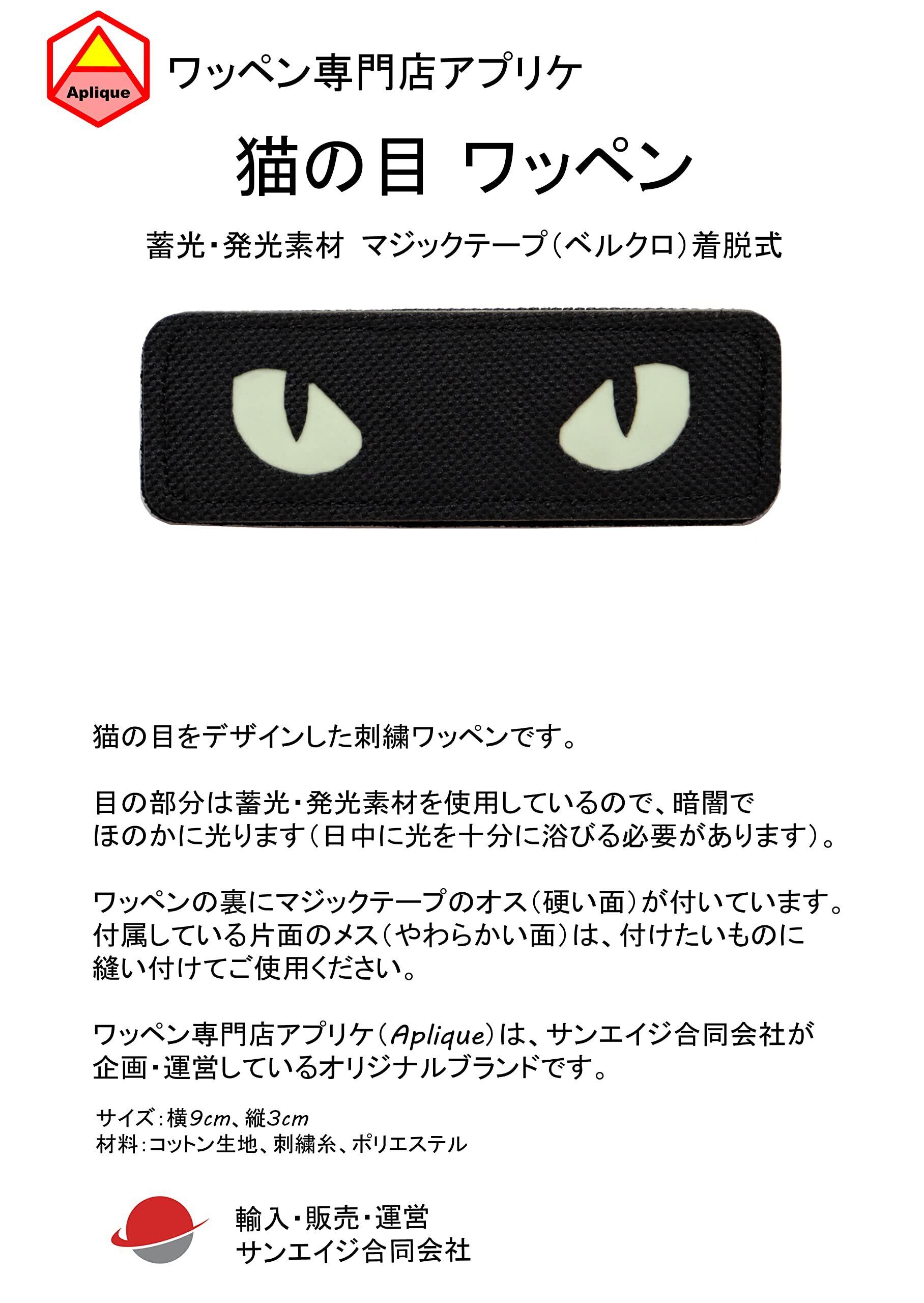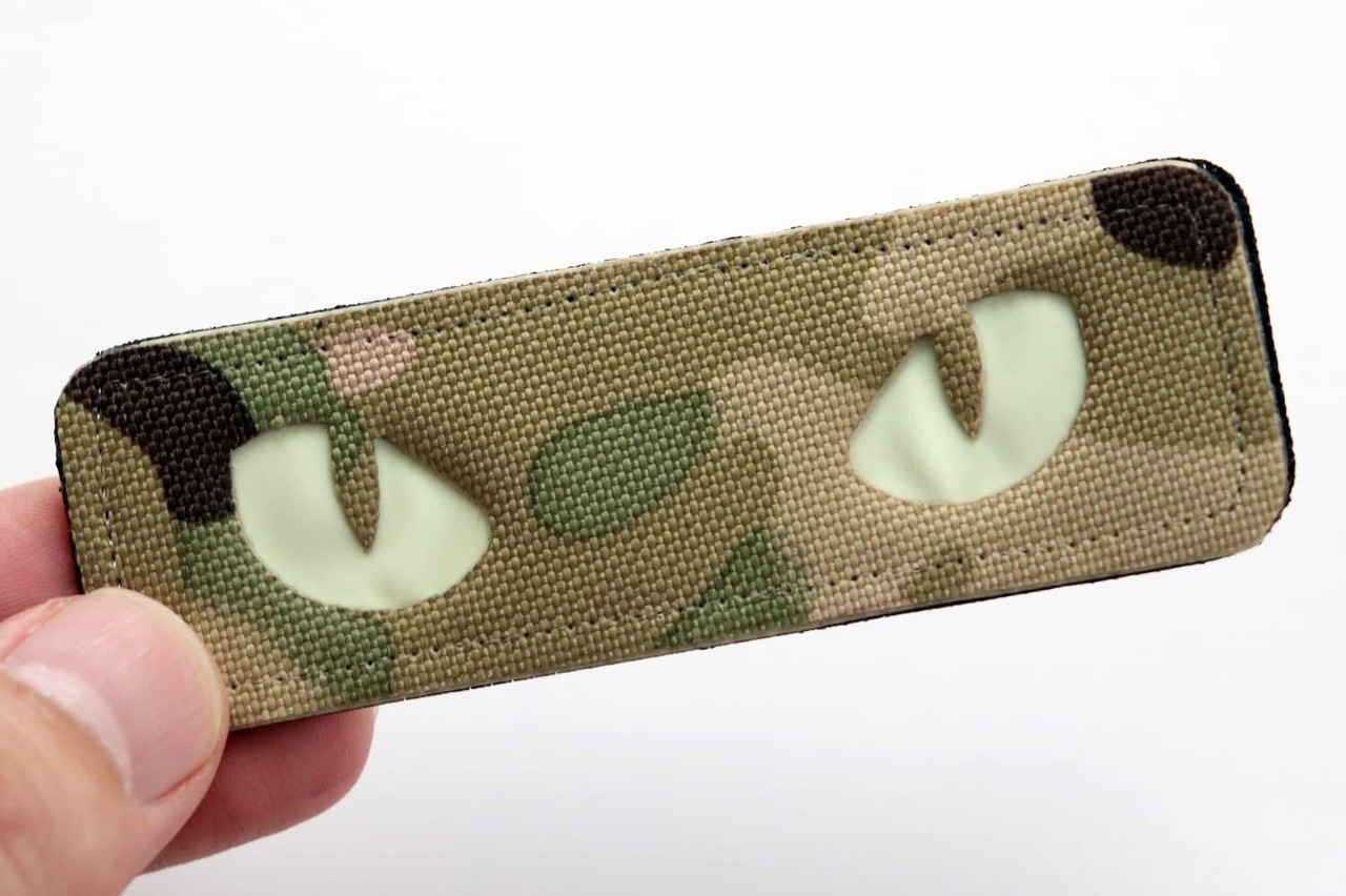 ワッペン 猫の目 蓄光・発光素材 マジックテープ(ベルクロ・面ファスナー)着脱式 ミリタリー サバゲー ネコの目が光る刺繍パッチ (迷彩柄)